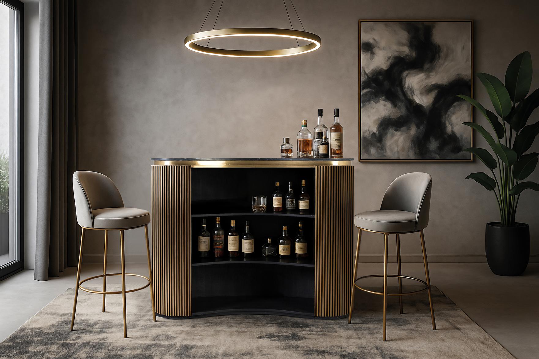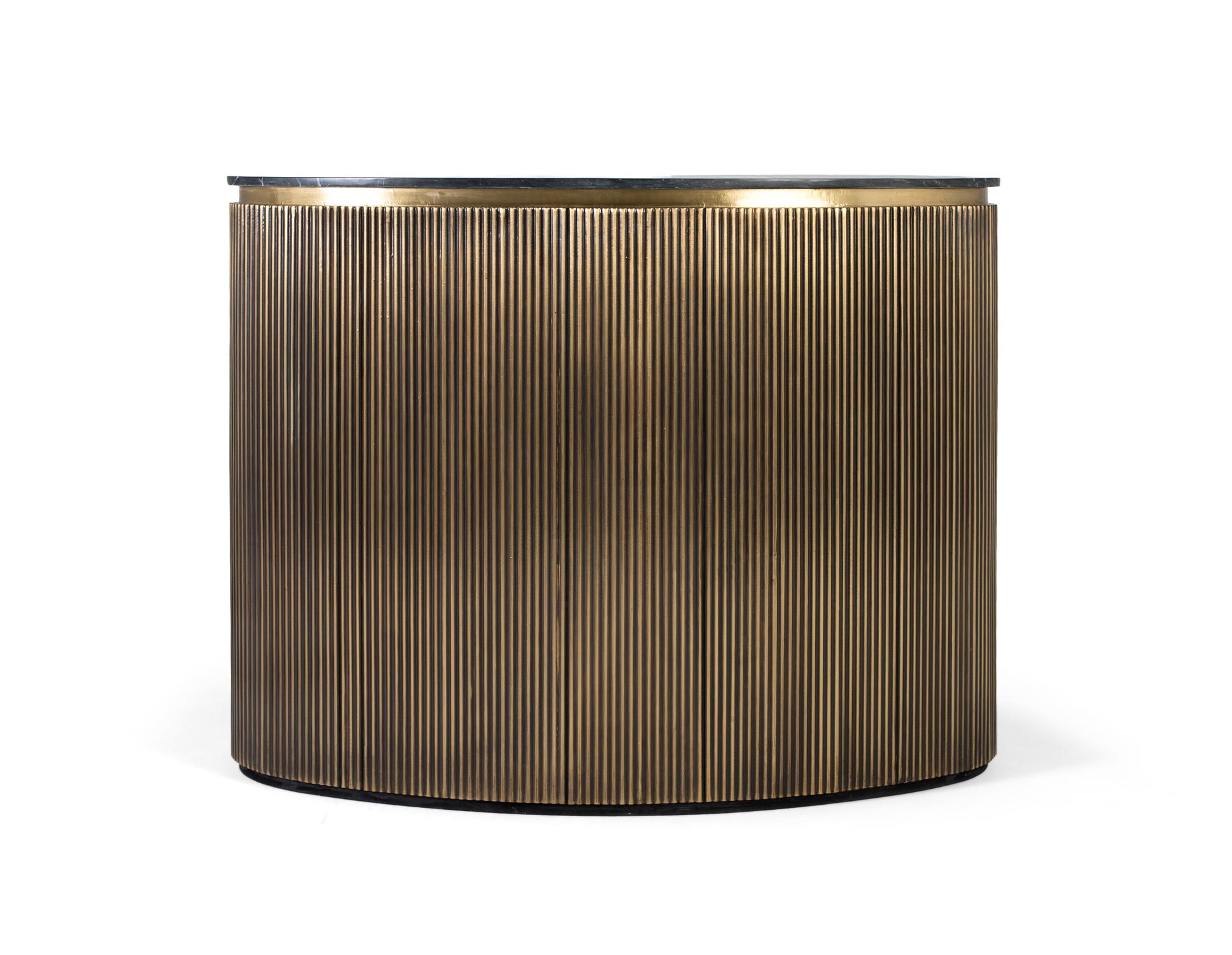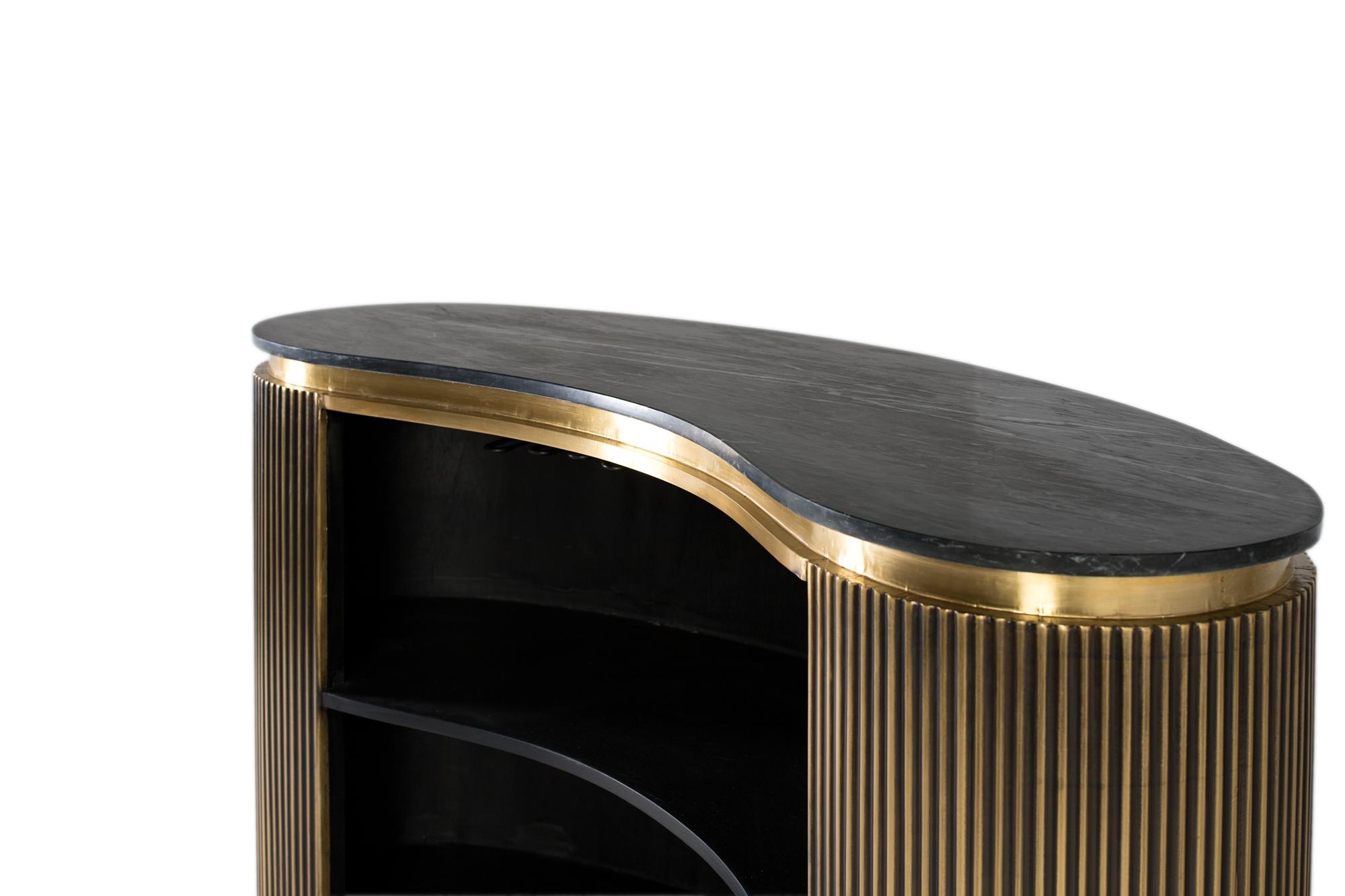 Elegantti moderni baarikaappi, jossa on kaareva ja hienostunut rakenne, joka yhdistää ensiluokkaiset materiaalit ja upeat viimeistelyt. Sen kaareva etuosa pystysuorilla kultaisilla säleillä antaa sille lumoavan art deco -tunnelman, lisäten tekstuuria ja dynaamisuutta kokonaisuuteen. Siinä on orgaanisesti muotoiltu musta marmoritaso, joka lisää ripauksen ylellisyyttä ja erottuvuutta, joten se sopii erinomaisesti juomien valmistukseen tai tarjoiluun. Sisällä mustat avoimet hyllyt tarjoavat helpon pääsyn ja runsaasti säilytystilaa tyylistä tinkimättä. Hyllyn korkeus: 32 cm. Sisähyllyn mitat: 140 x 41 cm. Marmorilevyn paksuus: 1, 6 cm.