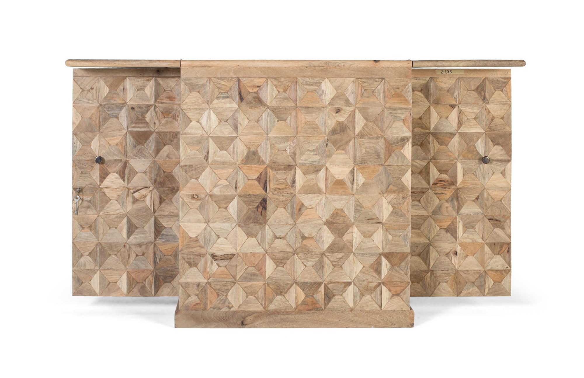 Tämä elegantti baarikaappi on valmistettu mangopuusta ja siinä on luonnollinen viimeistely. Kun avaat ovet ja kannen, kaappi kaksinkertaistuu pituudeltaan, jolloin siitä tulee ihanteellinen työtila juomien valmistukseen ja tarjoiluun. Sisällä huolellisesti suunniteltu laatikoiden ja lokeroiden asettelu tarjoaa runsaasti säilytystilaa pulloille, laseille ja aterimille. Kaapin etuosa on vuorattu geometrisiin kuvioihin järjestetyillä puupaloilla, jotka luovat modernin ja dynaamisen visuaalisen ilmeen, joka on vastakohta mangopuun luonnolliselle lämmölle. Etuosan mitat: 11 x 42 cm. Laatikon sisämitat: 9 x 39 x 26 cm. Oven mitat: 93 x 44 cm. Hyllyn korkeus: 24 cm. Sisähyllyn mitat: 42 x 32 cm. Kannen paksuus: 3 cm.