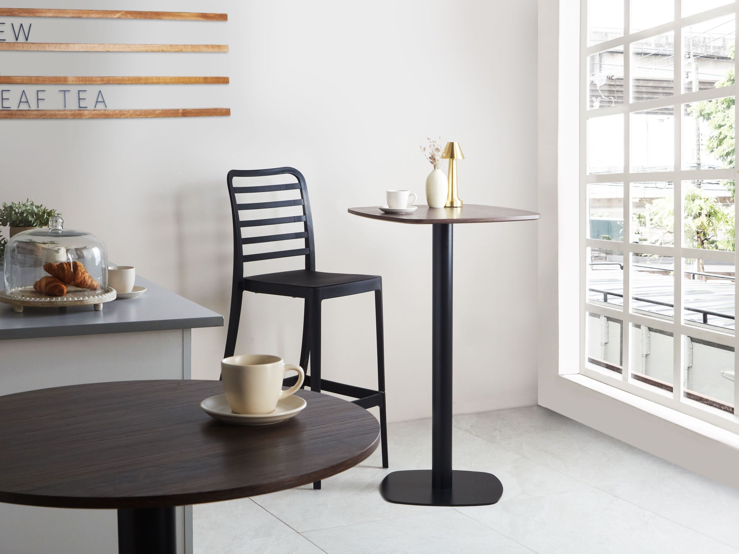 Moderni neliön muotoinen pöytä. Tämä nykyaikainen baaripöytä tarjoaa tyyliä viemättä liikaa tilaa, mikä tekee siitä tyylikkään ja modernin lisän mihin tahansa kotiin. Neliskulmaisessa MDF-levystä valmistetussa tasossa on klassinen paperiviilutettu viimeistely yhdistettynä kestävään ja tukevaan rautaiseen jalustaan, mikä luo puhtaan, minimalistisen ilmeen. Ihanteellinen pienempiin tai avoimiin tiloihin, joissa käytännöllisellä muotoilulla on merkitystä.