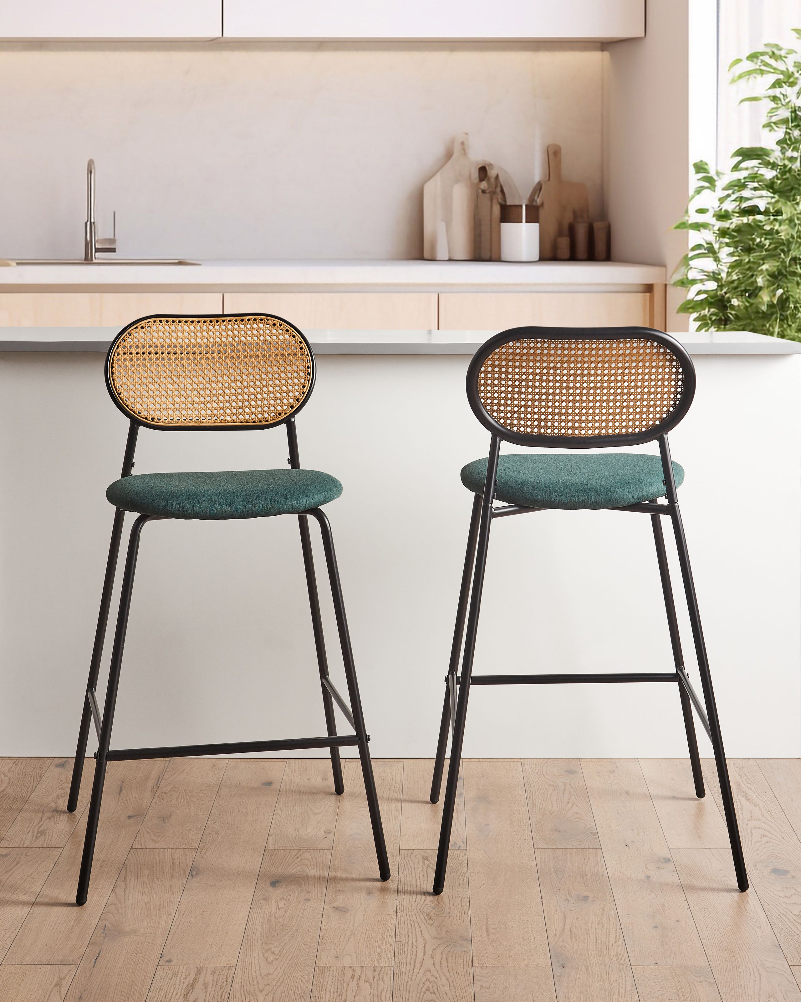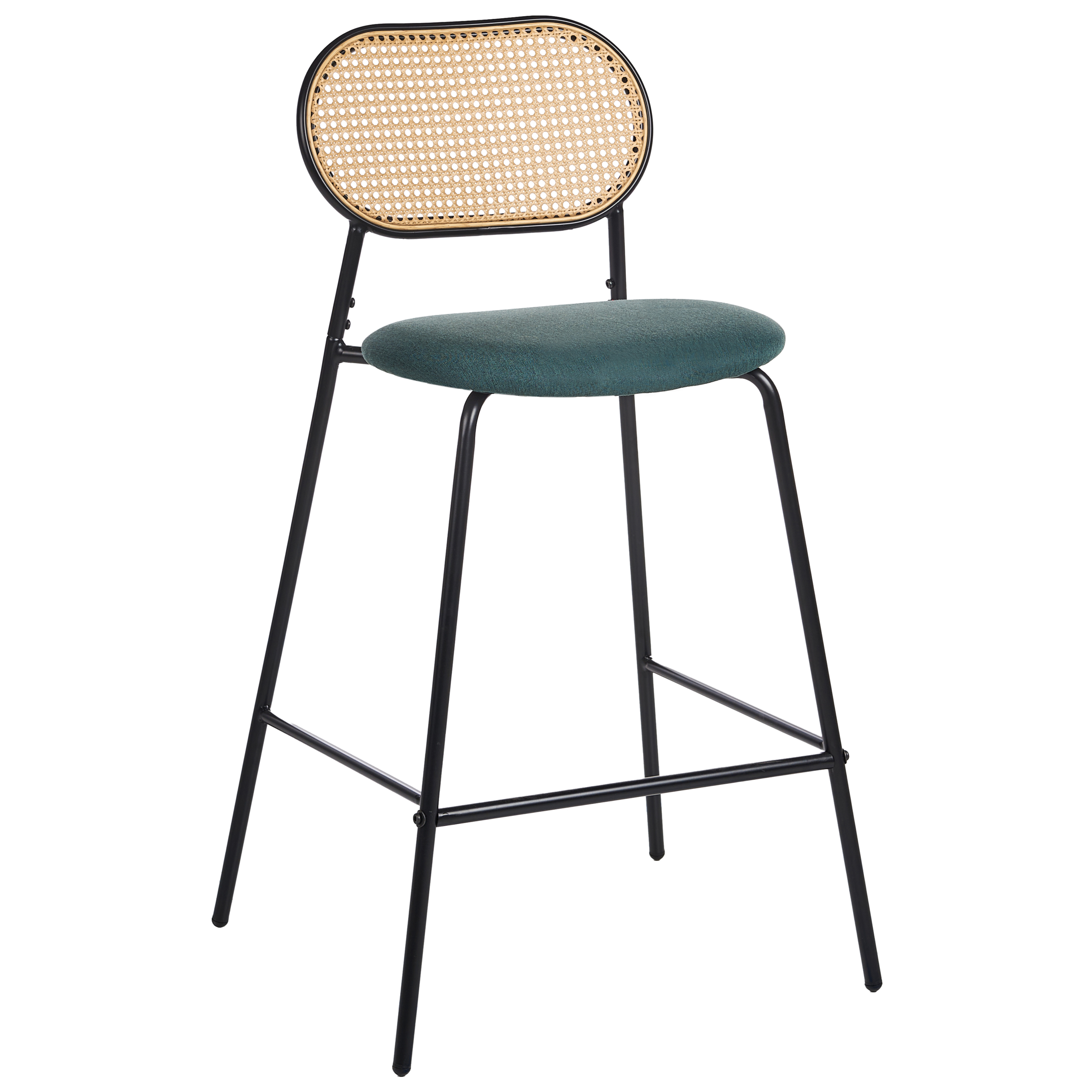 Retrotyyliset baarituolit rottinkisilla selkänojilla. Tässä kahden baarituolin setissä yhdistyvät saumattomasti kestävyys ja tyyli. Nauti retroestetiikan vetovoimasta rautarungon ja mustan viimeistelyn ansiosta, jotka henkivät nostalgista charmia. Tummanvihreät kangaspäällysteiset istuimet ja selkänojat, joita koristaa rottinkipunos, kohottavat mukavuuden taiteeksi. Määrittele tilasi uudelleen ripauksella eilisen glamouria ja nykypäivän toiminnallisuutta.