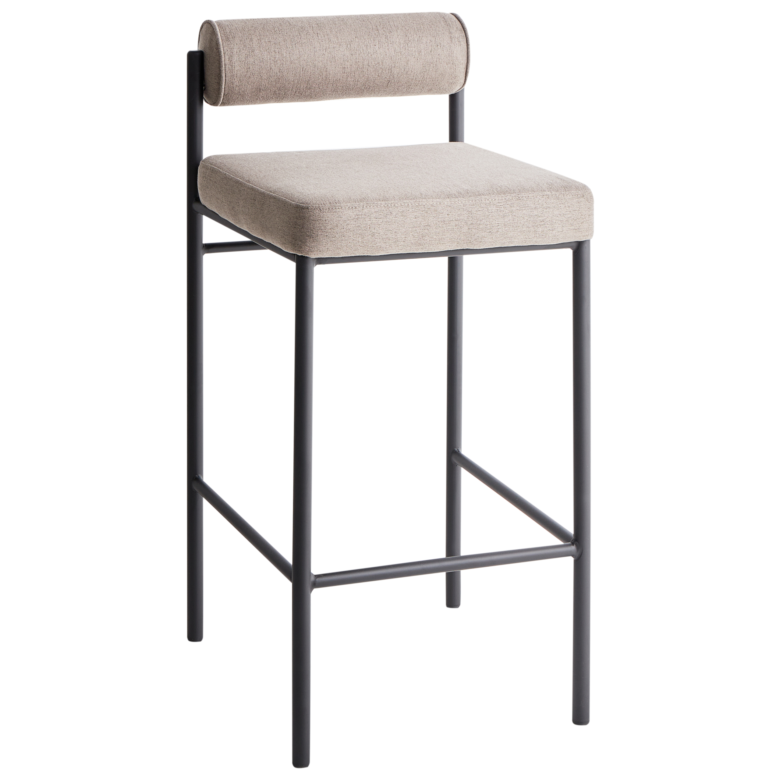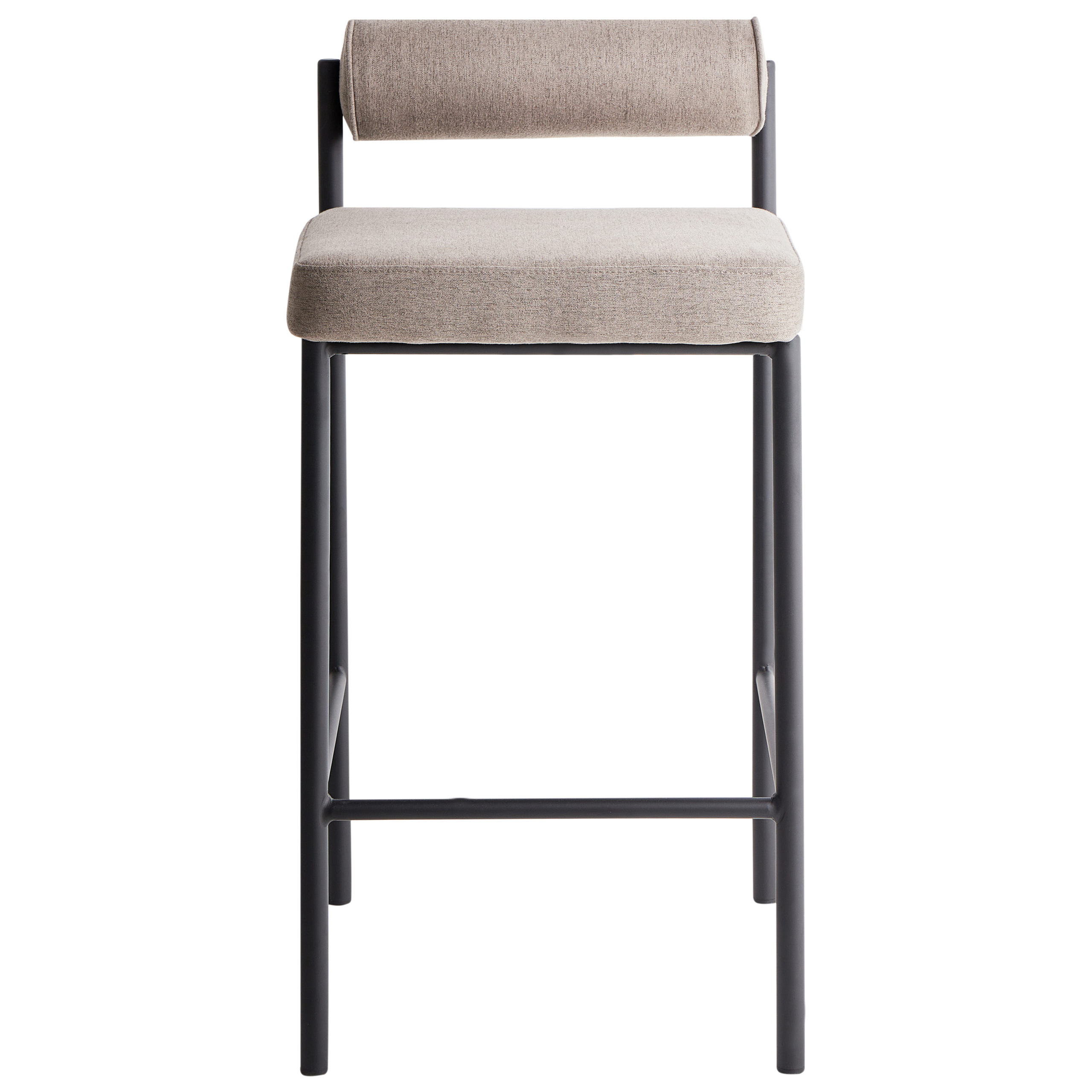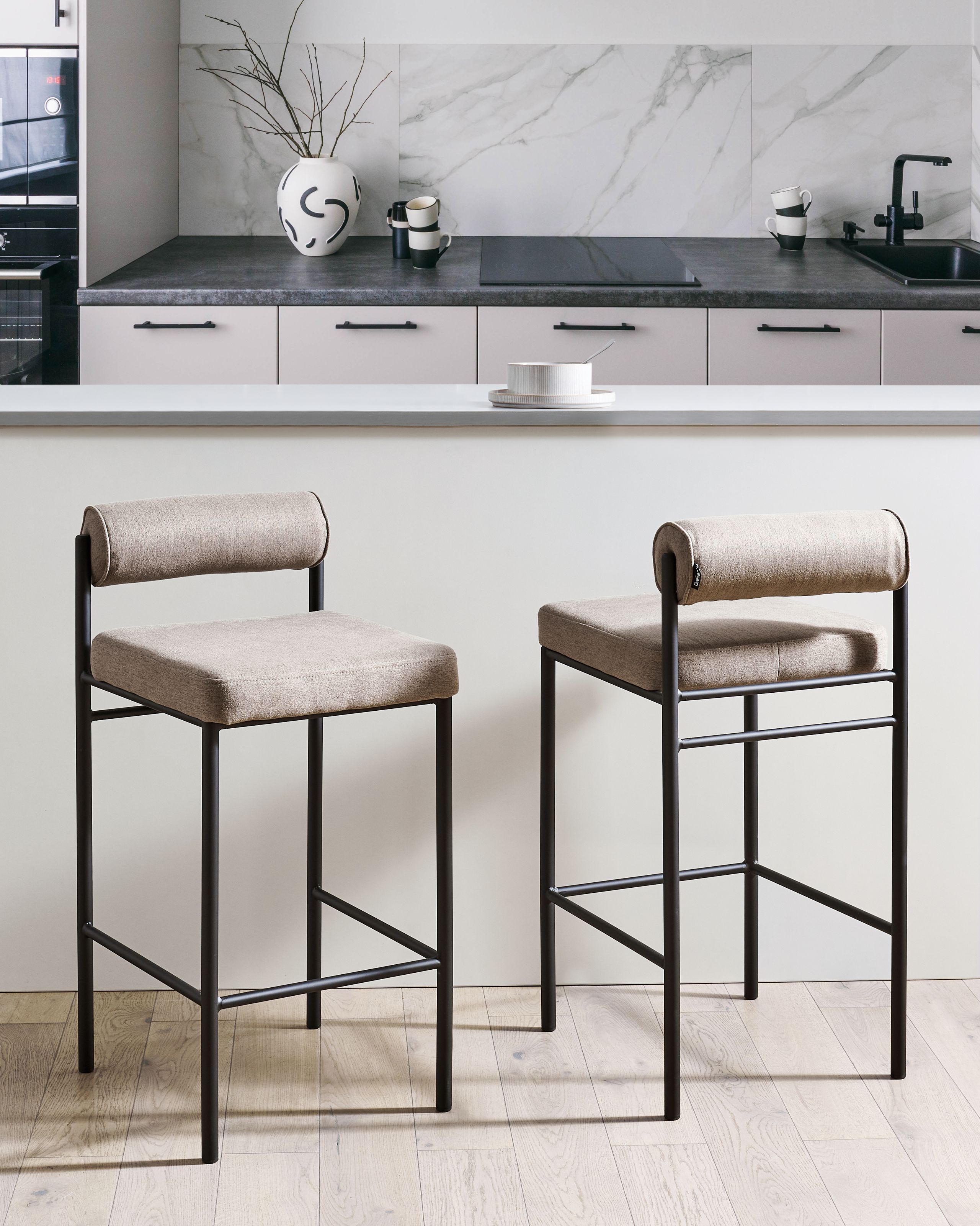Moderni käsinojaton baarituolisetti. Kohota ruokailutilaa tai keittiötä hetkessä tällä tyylikkäällä kahden baarituolin setillä. Laadukkaalla ruskeanharmaalla polyesterikankaalla verhoiltujen tuolien jalat on valmistettu kestävästä, mustaksi jauhemaalatusta raudasta. Matalat, sylinterimäiset ja pyöristetyt selkänojat sekä tukevat jalkatuet tarjoavat mukavan istumakokemuksen. Käsinojattoman muotoilun ansiosta ne on helppo työntää saarekkeen tai pöydän alle, silloin kun niitä ei tarvita. Muotoilunsa ja värimaailmansa ansiosta baarituolit sulautuvat useisiin sisustustyyleihin.
