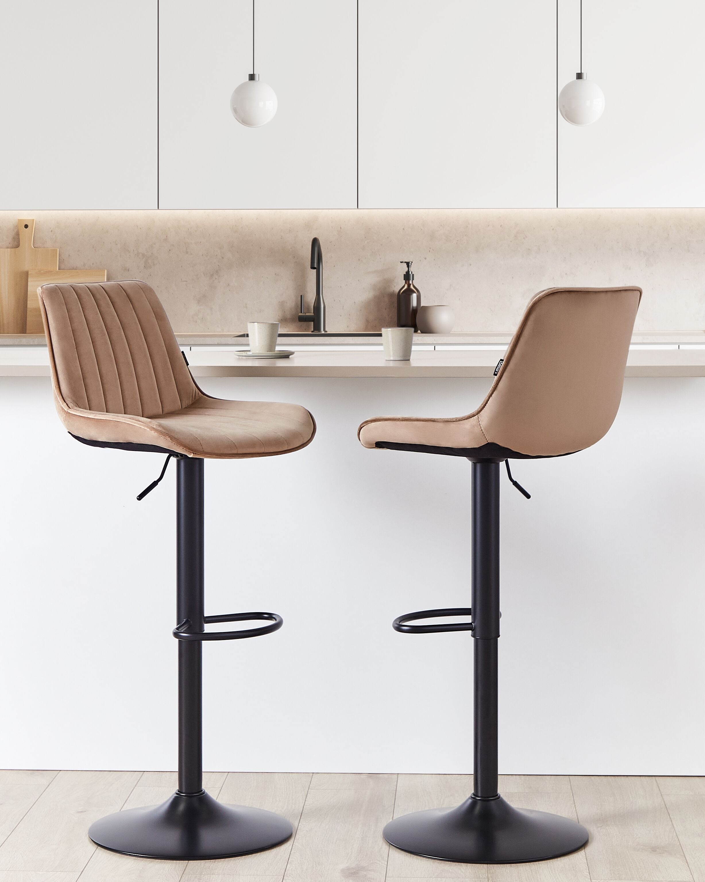 Kääntyvä baarijakkarasetti jalkatuilla. Lisää ripaus eleganssia ruokailutilaan tai keittiöön tällä kahden baarituolin setillä. Pehmeällä samettikankaalla verhoillut ja pystytikkauksella koristellut jakkarat tuovat sisustukseen ylellistä ja tyylikästä tunnelmaa. Kussakin jakkarassa on kestävä, jalkatuella varustettu teräsjalka, joka tarjoaa vakautta ja pitkäikäisyyttä. Lisäksi baarijakkarat kääntyvät 360 astetta, ja niiden korkeus on säädettävissä. Ne sopivat loistavasti mihin tahansa moderniin kotiin, tuoden tilaan tyyliä, mukavuutta ja toiminnallisuutta.