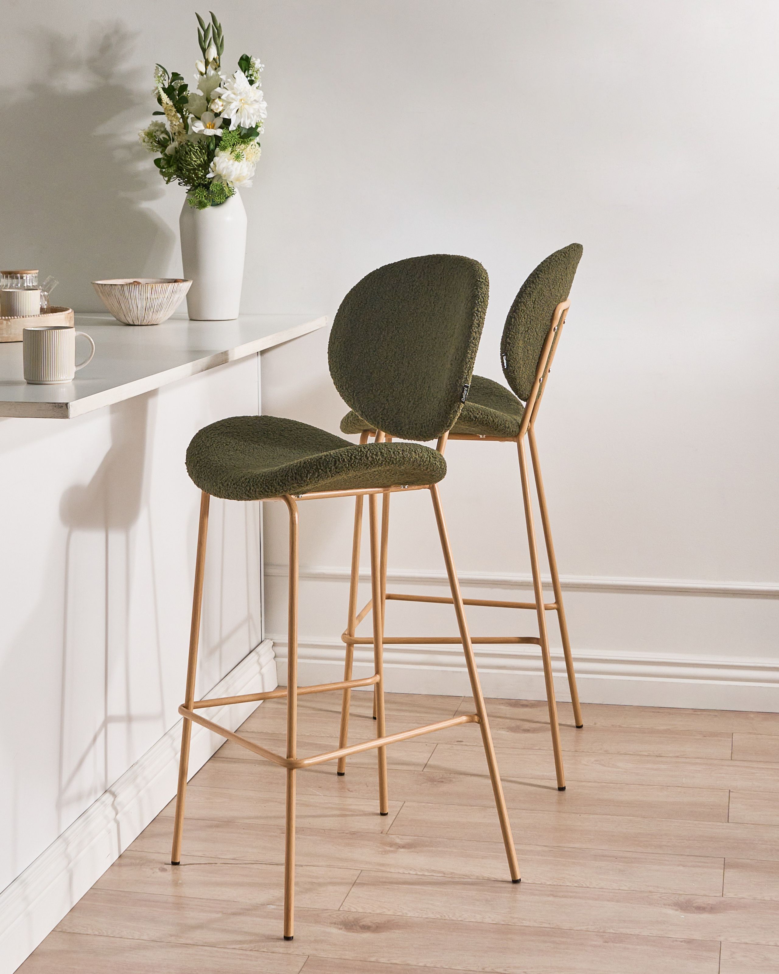 Retrotyylinen käsinojaton baarituolisetti. Korosta ruokailutilaa tällä kahden baarituolin setillä, joka yhdistää mukavuuden ja kestävyyden. Pehmeällä bukleekankaalla verhoillut baarituolit näyttävät kauniilta sekä moderneissa että klassisissa sisustuksissa ja tarjoavat miellyttävän istumiskokemuksen. Tukevat ja helppohoitoiset puukuvioidut rautajalat lisäävät muotoiluun luonnollista ilmettä, ja niiden pohjassa olevat muovitapit suojaavat lattiaa naarmuilta. Baarituolit ovat täydellinen lisä jokaiseen ruokailutilaan.