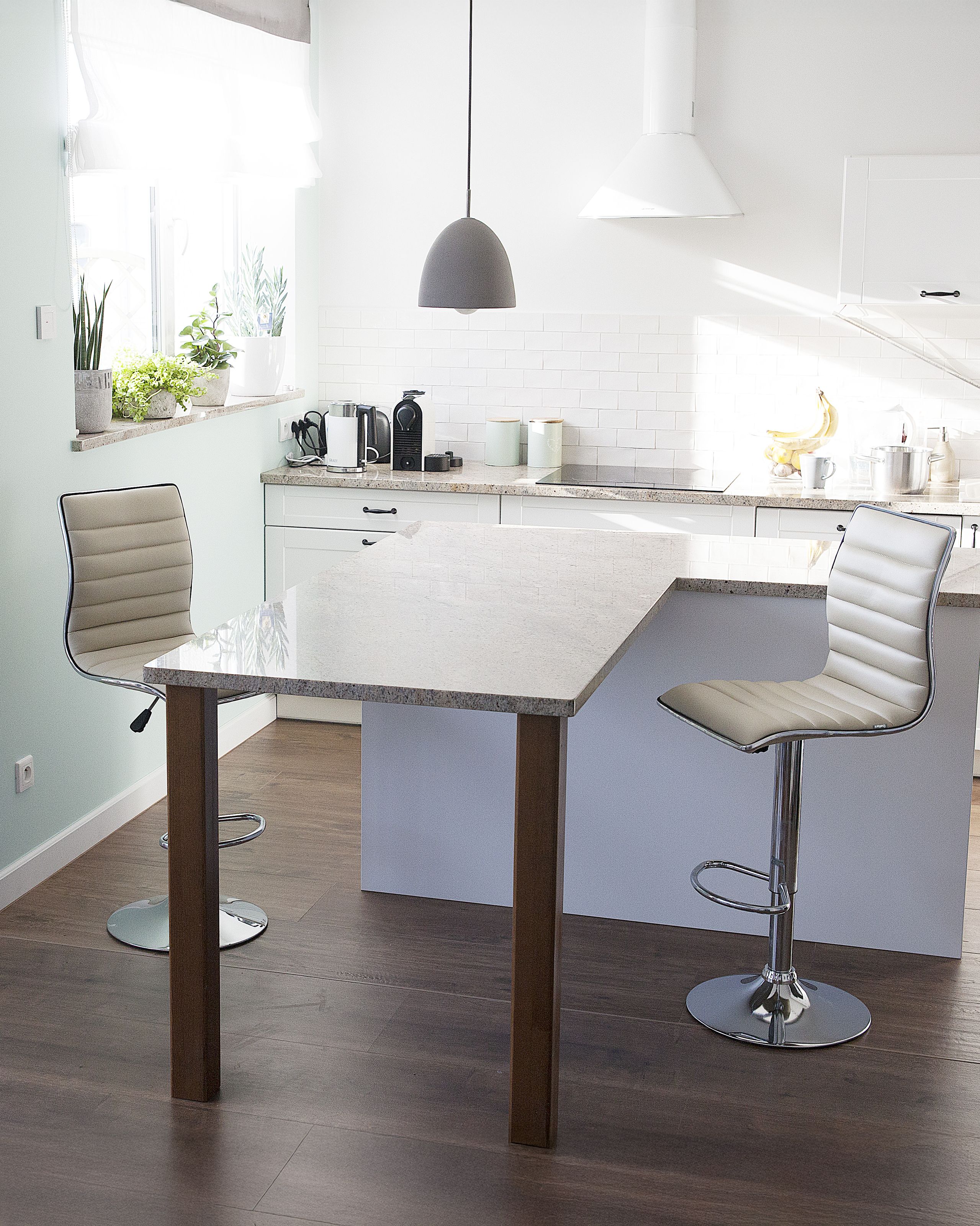 Moderni baarijakkarasetti. Tämä moderni ja mukava baarijakkarasetti sopii erityisen hyvin etenkin nykyaikaisiin sisustuksiin. Tuolien paksusti pehmustetut istuimet on verhoiltu keinonahalla, jossa on tyylikäs vaakasuora tikkaus. Verhoilun vaalea väri kohentaa tilan yleisilmettä, luoden rauhallisen tunnelman. Kromatusta metallista valmistetut jalustat on varustettu jalkatuella sekä leveällä liukumattomalla pohjalla. Baarituolit kääntyvät 360 astetta ja niiden korkeutta on mahdollisuus säätää tarpeen mukaan.