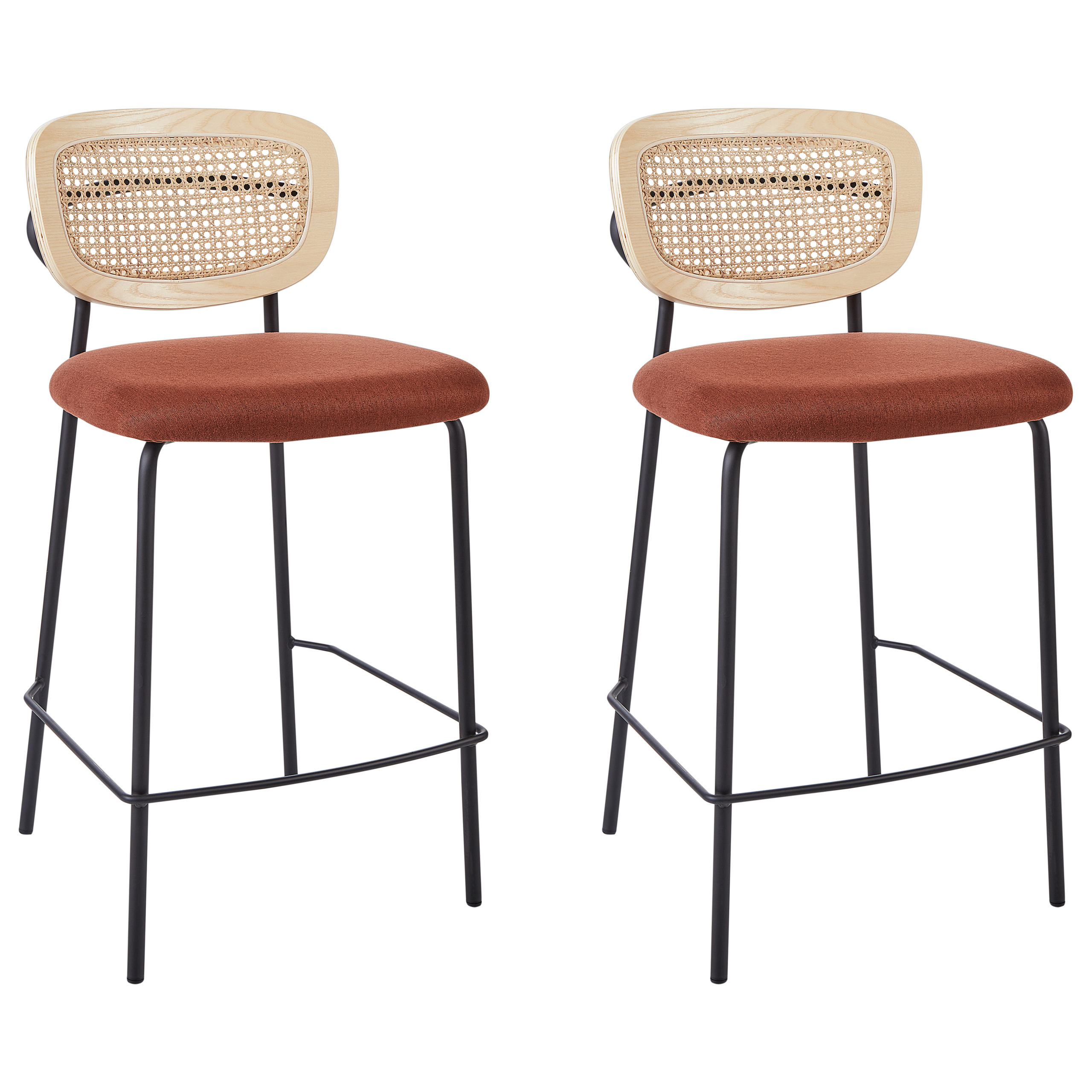 Retrotyylinen baarituolisetti rottinkipunoksella. Tee ruokailutilasta tai keittiöstä erottuva tällä tyylikkäällä kahden baarituolin setillä. Kestävällä oranssilla polyesterikankaalla verhoiltujen tuolien jalat on valmistettu mustaksi jauhemaalatusta raudasta. Materiaaliensa ansiosta ne kestävät vuosien käytön, kun taas värimaailma nostattaa huoneen sisustuksen uusiin korkeuksiin. Molemmissa baarijakkaroissa on kauniisti kaartuva, rottinkipunoksella koristeltu selkänoja, joka takaa mukavuuden. Käsinojattoman muotoilun ansiosta ne on helppo työntää saarekkeen alle, silloin kun niitä ei tarvita.