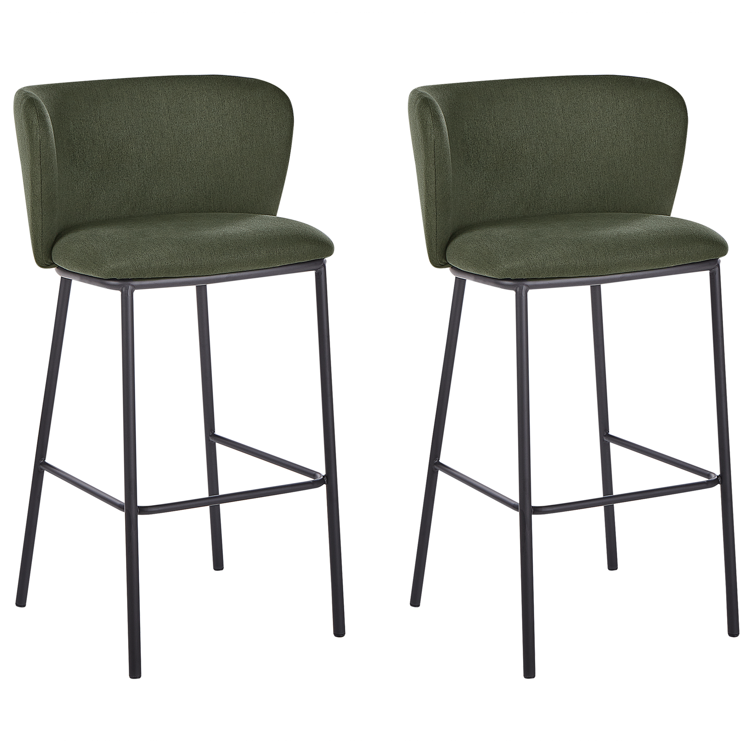 Moderni käsinojaton baarituolisetti. Tee ruokailutilasta erottuva tällä tyylikkäällä kahden baarituolin setillä. Kestävällä tummanvihreällä polyesterikankaalla verhoiltujen tuolien jalat on valmistettu mustaksi jauhemaalatusta raudasta. Materiaaliensa ansiosta ne kestävät vuosien käytön, kun taas värimaailma nostaa huoneen sisustuksen uusiin korkeuksiin. Kussakin baarituolissa on kauniisti kaartuva selkänoja sekä kätevä jalkatuki, jotka takaavat mukavuuden. Käsinojattoman muotoilun ansiosta ne on helppo työntää saarekkeen alle silloin, kun niitä ei tarvita.