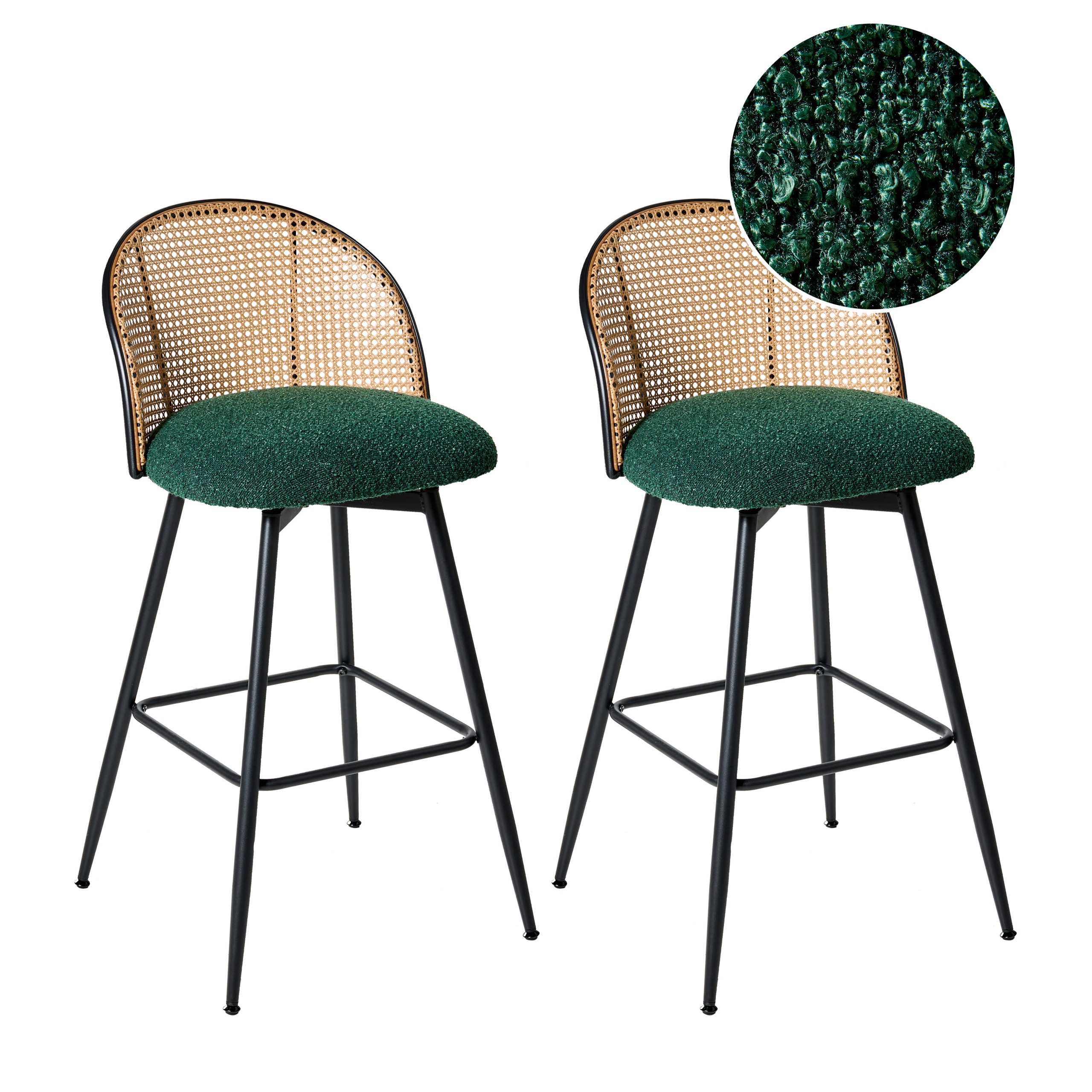 Retrotyyliset pyörivät baarituolit wieniläispunoksella. Tuo tilaan ajatonta charmia ja jokapäiväistä mukavuutta tällä kahden baarituolin setillä, joka sopii täydellisesti niin ruokailuun kuin rentoutumiseen. Tyylikkäissä ja käytännöllisissä tuoleissa on kestävät mutta pehmeät tummanvihreät bukleeverhoillut istuimet, elegantit synteettisestä rottingista valmistetut wieniläispunotut selkänojat ja tukevat mustat metallirungot. 360 astetta kääntyvät istuimet lisäävät mukavuutta, joten nämä baarituolit ovat sekä tyylikäs että toimiva lisä mihin tahansa sisustukseen.