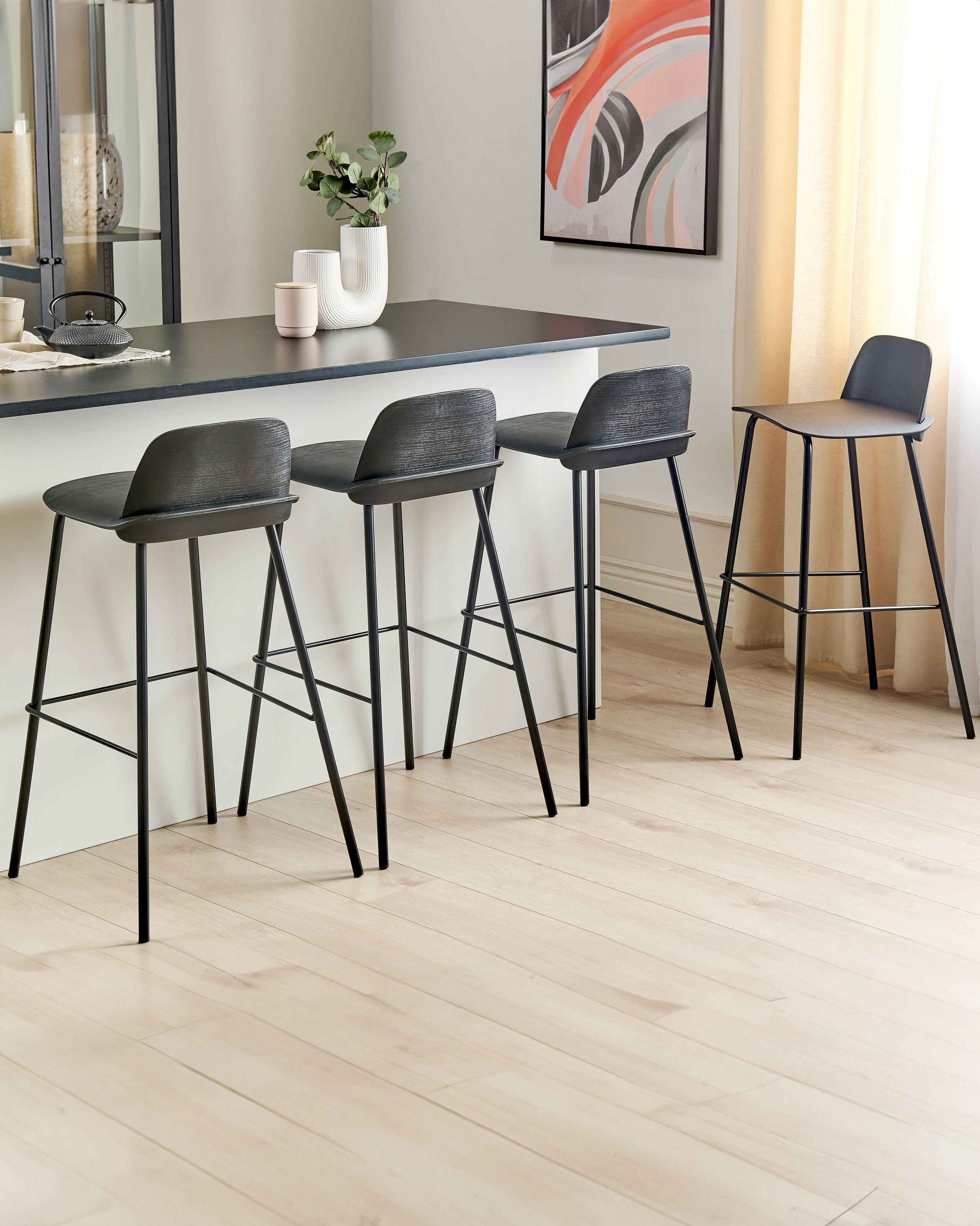 Neljän baarijakkaran setti. Tuo modernia hienostuneisuutta näillä neljällä modernilla baarijakkaralla. Tyylikkäät synteettiset istuimet tarjoavat mukavuutta ja helppohoitoisuutta, ja vankat teräsjalat takaavat vakauden sekä kestävyyden. Viimeistele baaritiskin tai keittiösaarekkeen ilme tämän tyylikkään setin avulla.