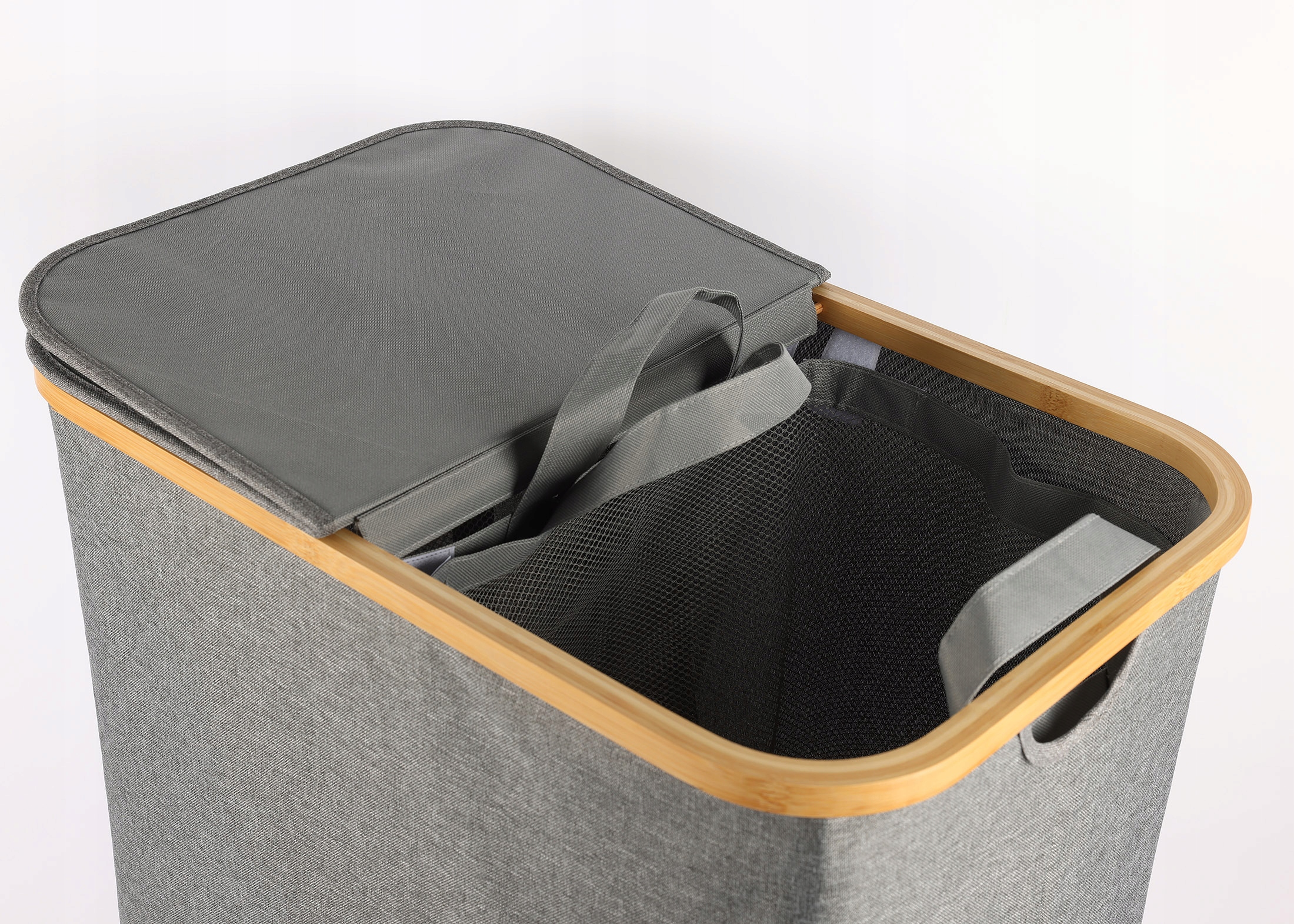 Pyykkikori on käytännöllinen ja korvaamaton ratkaisu jokaiseen kotiin. Valmistettu kestävästä materiaalista, mikä varmistaa pitkäkestoisen käytön. Siihen mahtuu suuri määrä likaisia vaatteita, pitäen pyykkitupasi tai kylpyhuoneesi siistinä. Kori sisältää kaksi lokeroa ja kannen, ja sisällä olevat korit ovat irrotettavia. Se tarjoaa vankan rakenteen ja luonnollisen, silmää miellyttävän ulkonäön. Harmaa väri lisää eleganssia ja hienovaraisuutta, täydentäen erilaisia sisustustyylejä.
