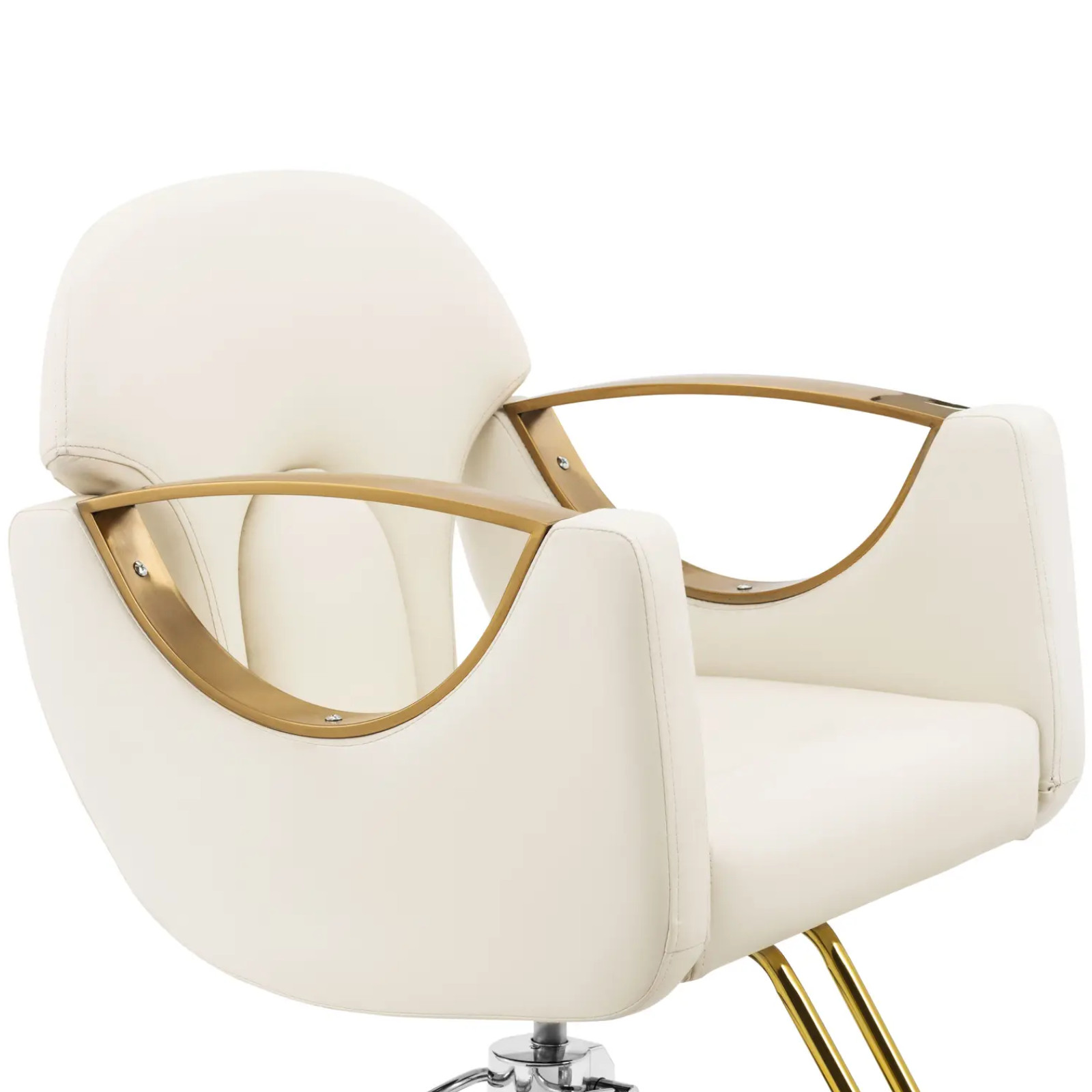 BARTON CREAM Kampaamotuoli luo mukavan tilan asiakkaille ja lisää tyyliä kampaamoosi. Hienovarainen kermanvärinen muotoilu täydentää mitä tahansa sisustusta. Tämä kampaamotuoli jalkatuella ja verhoillulla selkänojalla ilahduttaa vieraita maksimaalisella mukavuudella. Olipa kyseessä kampaamo, tatuointistudio tai kauneushoitola, kampaamotuolin runko on valmistettu kestävästä ja elegantista ruostumattomasta teräksestä. Vankka rakenne tukee turvallisesti 180 kg:n kuorman ja tarjoaa tuolille tukea ja kestävyyttä. Suuri, 55 cm:n halkaisijaltaan oleva jalusta tarjoaa lisävakautta. Sileät ruostumattomasta teräksestä valmistetut pinnat korostavat tyylikästä ulkonäköä. Tuoli tarjoaa ergonomisen asennon korkeiden käsinojien ja korkealaatuisen vaahtomuovin ansiosta. Kestävä keinonahkaverhoilu on helppo puhdistaa. Tuolissa on pölyä ja vettä hylkivät ominaisuudet. Tuolin korkeutta voidaan helposti säätää 55 ja 65 cm välillä hydraulipumpulla. Tuolia voidaan kääntää 360°, minkä ansiosta saavutat optimaalisen työasennon, joka ei väsytä sinua edes kiireisinä päivinä. Jalkatuki lisää istumismukavuutta.