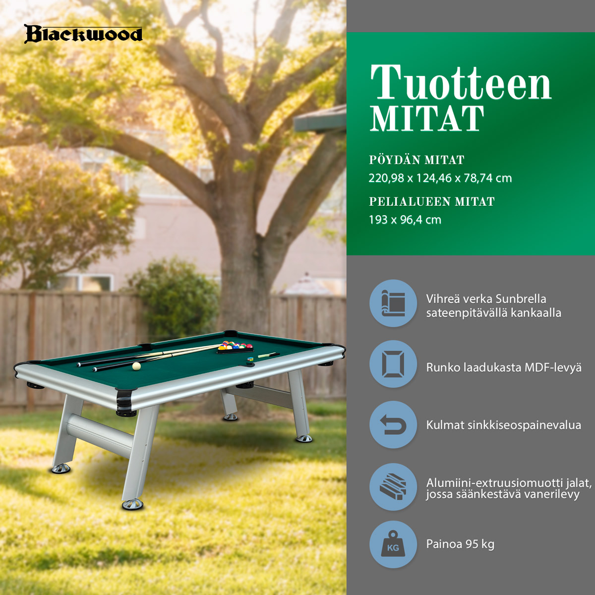 https://www.hobbybox.fi/biljardipoyta-blackwood-outdoor-87133Biljardipöytä Blackwood Outdoor 8’https://www.hobbybox.fi/media/catalog/product/b/l/blackwood-biljardipoyta-outdoor8-1.jpg13901890EURInStockBlackwood/Akeneo Initial/Vapaa-aika/Vapaa-ajan pelipöydät/Biljardipöydät/Brändit/Blackwood/Vapaa-aika/Vapaa-aika/Vapaa-ajan pelipöydät/Rahtituotteet/Black Friday6242192775392176299678<p><span style="font-weight: 700;">Biljardipöytä Blackwood Outdoor 8’</span></p><p>Hankkimalla oma biljardipöytä voit pelata biljardia omassa rauhassa juuri silloin, kun haluat! Tämä Blackwoodin upea biljardipöytä on suunniteltu ulkokäyttöön, joten pelisessioiden aikana voit nauttia samalla raikkaasta ulkoilmasta ja upeasta säästä. </p><p>Blackwood Outdoor 8' biljardipöytä on täydellinen ratkaisu, sillä se on baarien ja biljardihallien standardikokoa vastaava pöytä ja se on valmistettu kestävistä materiaaleista ulkokäyttöä varten. Pöydän runko on hopeanvärinen ja se on valmistettu laadukkaasta E1-standardin mukaisesta MDF-levystä.</p><p> Pelialusta on valmistettu säänkestävästä vanerilevystä, joka on päällystetty luotettavalla sateenpitävällä Sunbrella-kankaalla. Pelipöydän kulmat ovat mustat ja ne ovat valmistettu sinkkiseospainevalusta. Jalat ovat alumiini-ekstruusiomuottia ja niissä on säänkestävä vanerilevy.</p><p><span style="font-weight: bold;">Tekniset tiedot:</span></p><ul><li>Rungon väri: hopea</li><li>Maton väri: vihreä</li><li>Maton materiaali: Sunbrella sateenpitävä kangas</li><li>Pelialustan materiaali: Säänkestävä vanerilevy</li><li>Kulmat: Sinkkiseospainevalua - mustat</li><li>Jalat: Alumiini-ekstruusiomuotti, jossa on säänkestävä vanerilevy</li><li>Paino: 95 kg</li><li>Paketti sisältää: Biljardipöydän, 2 kpl biljardikeppejä, biljardipallosetin, kolmion ja 2 kpl liituja</li><li>Mitat: 224x124x79 cm</li><li>Pelialueen mitat: 193x96.4cm</li><li>Pakkauksen mitat: 229,9 x 138,4 x 15,9 cm</li><li>Pakkauksen paino: 108,8 kg</li></ul>EUR00https://www.hobbybox.fi/media/catalog/product/b/l/blackwood-biljardipoyta-outdoor8-1.jpg?width=320&height=440https://www.hobbybox.fi/media/catalog/product/b/l/blackwood-biljardipoyta-outdoor8-ls-1.jpg?width=320&height=440https://www.hobbybox.fi/media/catalog/product/b/l/blackwood-outdoor-8-prioa1-FIN.jpg?width=320&height=440https://www.hobbybox.fi/media/catalog/product/b/l/blackwood-outdoor-8-prioa2-FIN.jpg?width=320&height=440https://www.hobbybox.fi/media/catalog/product/b/l/blackwood-outdoor-8-prioa3-FIN-v2.jpg?width=320&height=440https://www.hobbybox.fi/media/catalog/product/b/l/blackwood-biljardipoyta-outdoor8-2.jpg?width=320&height=440https://www.hobbybox.fi/media/catalog/product/b/l/blackwood-biljardipoyta-outdoor8-3.jpg?width=320&height=440https://www.hobbybox.fi/media/catalog/product/b/l/blackwood-biljardipoyta-outdoor8-4.jpg?width=320&height=440add-to-cartshort_description:<ul>