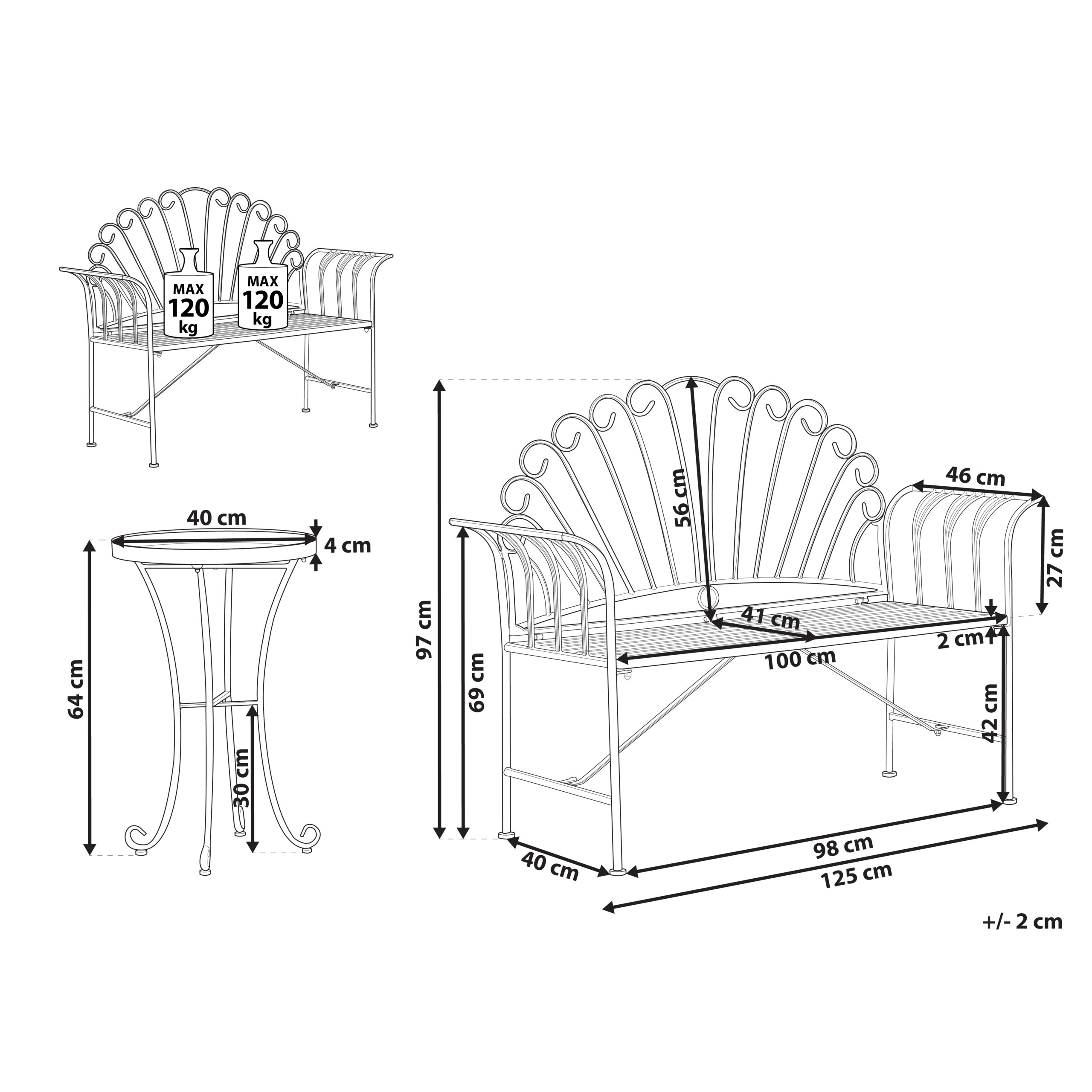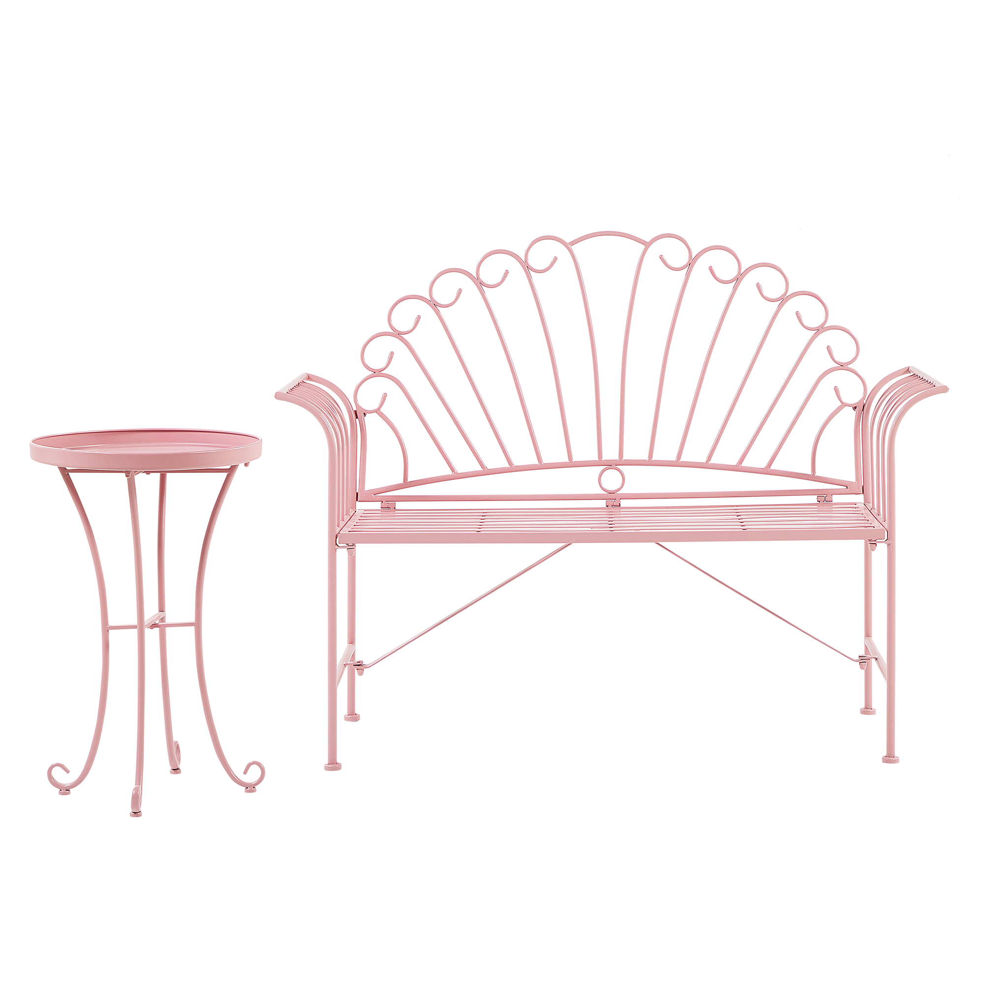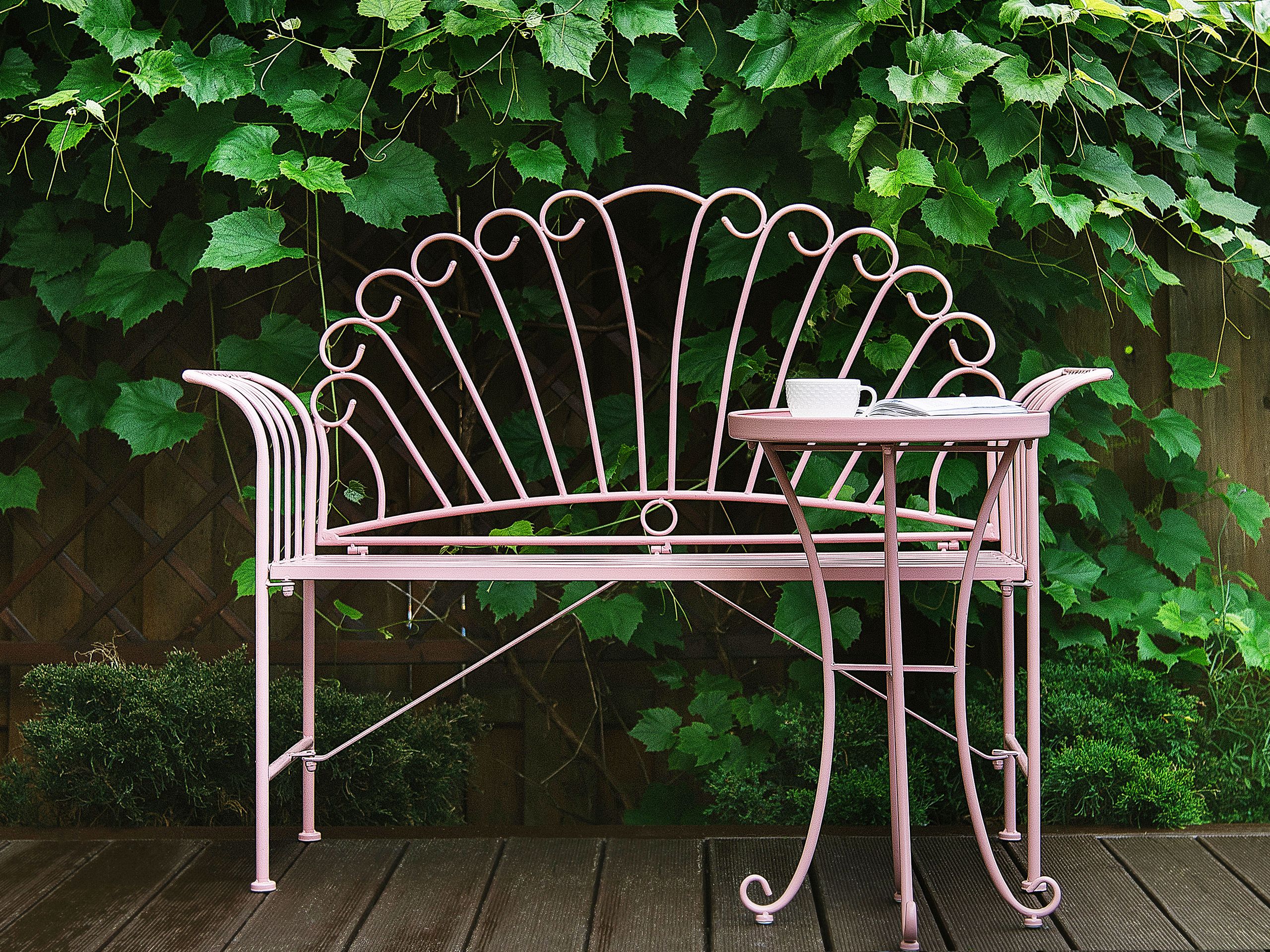 Vintage-tyylinen puutarhapenkki ja pöytä. Tuo puutarhaan, parvekkeelle tai terassille vintage-viehätystä tällä hurmaavalla bistrosetillä, johon kuuluu puutarhapenkki ja sivupöytä. Tukevasta ja kestävästä raudasta valmistetut kalusteet tarjoavat mukavan paikan nauttia aamukahvit kahdelle hengelle. Penkin koristeellinen selkänoja ja levenevät, hennosti kaartuvat käsinojat sekä pöydän koristeelliset jalat ammentavat inspiraatiota vanhan ajan glamourista, minkä ansiosta setti sulautuu täydellisesti retrotyylisiin ja perinteisiin sisustuksiin. Ajaton vaaleanpunainen väri lisää luonnetta mihin tahansa ympäristöön.