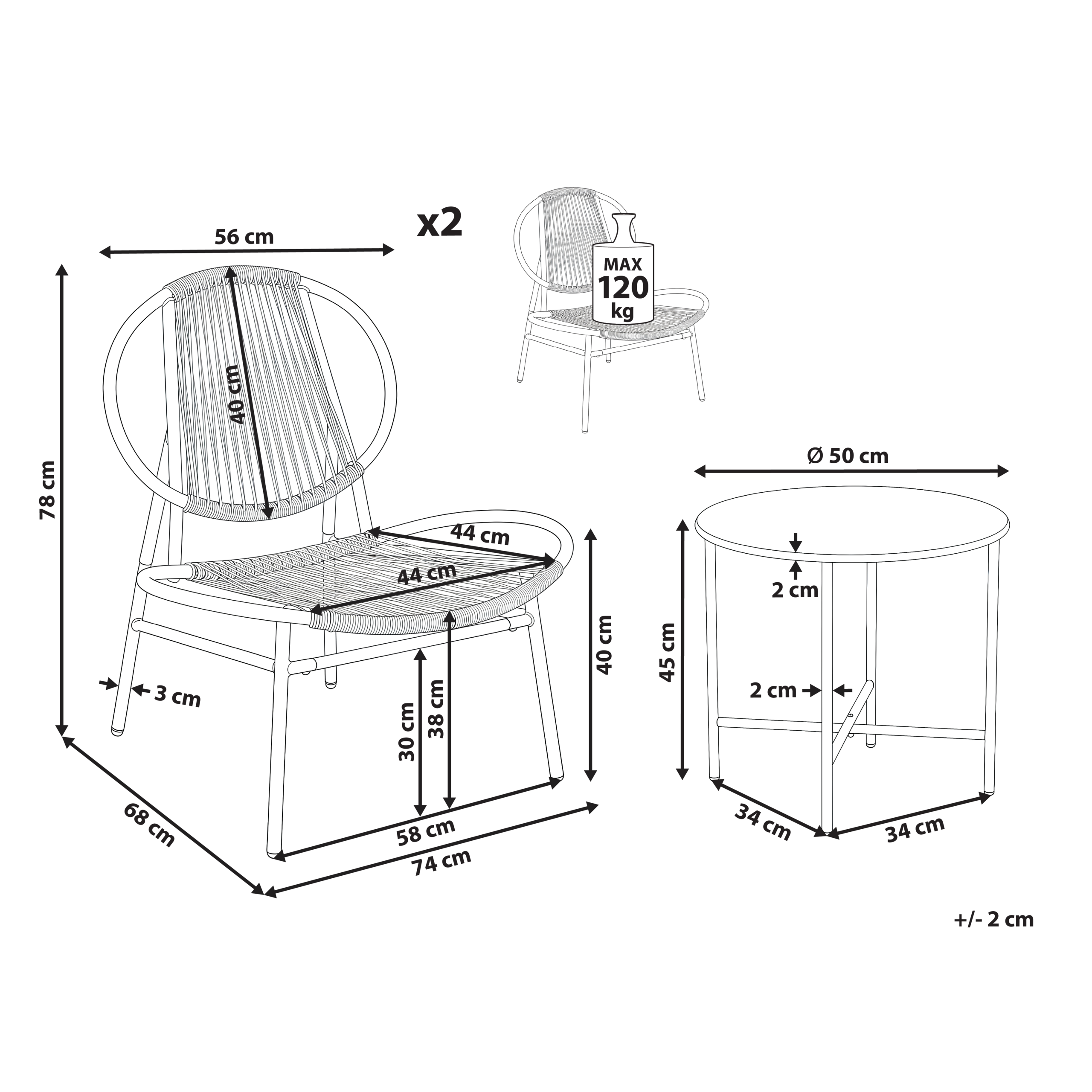 Kestävyystesti: Erityispintakäsittelyn ansiosta tämän tuotteen pinta kestää ruostetta. Tämä tarkoittaa, että sitä voidaan käyttää ulkona. Kun huonekalu ei ole käytössä, on suositeltavaa käyttää suojapeitettä tai säilyttää se kuivassa paikassa.