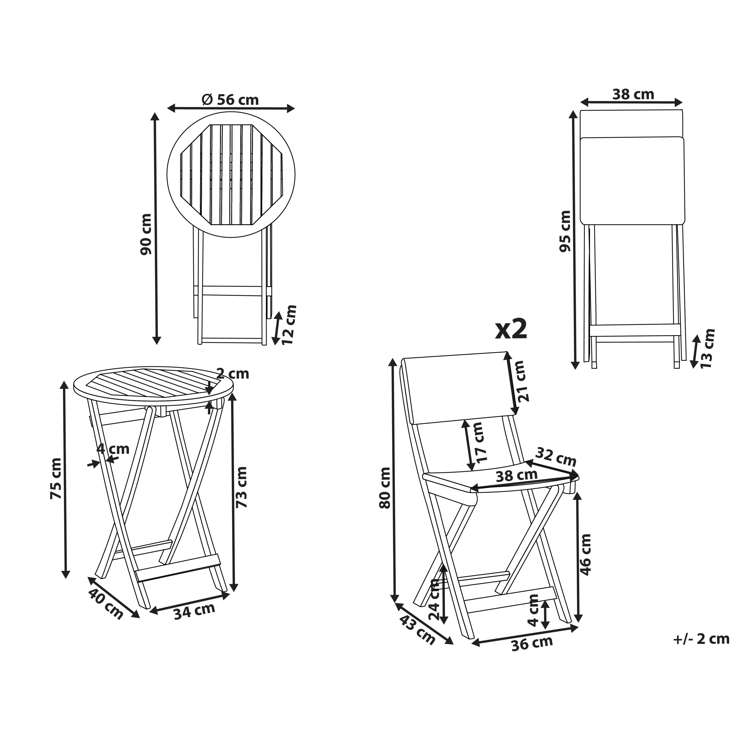 Kokoontaitettava pöytä ja tuolit parvekkeelle. Anna terassillesi tai parvekkeellesi raikas ilme tällä kokoontaitettavalla bistrosetillä, joka koostuu pienestä pyöreästä pöydästä ja kahdesta elegantista tuolista. Kalusteet on valmistettu tukevasta akaasiapuusta, jota täydentää tuolien istuimissa ja selkänojissa oleva musta polyrottinkipunos. Materiaaliensa ansiosta setti on sekä mukava että kestävä, ja se tuo ulkotilaan ajatonta tyyliä. Se tarjoaa täydellisen paikan vaihtaa kuulumisia ystävän kanssa tai uppoutua suosikkikirjoihisi avotaivaan alla.