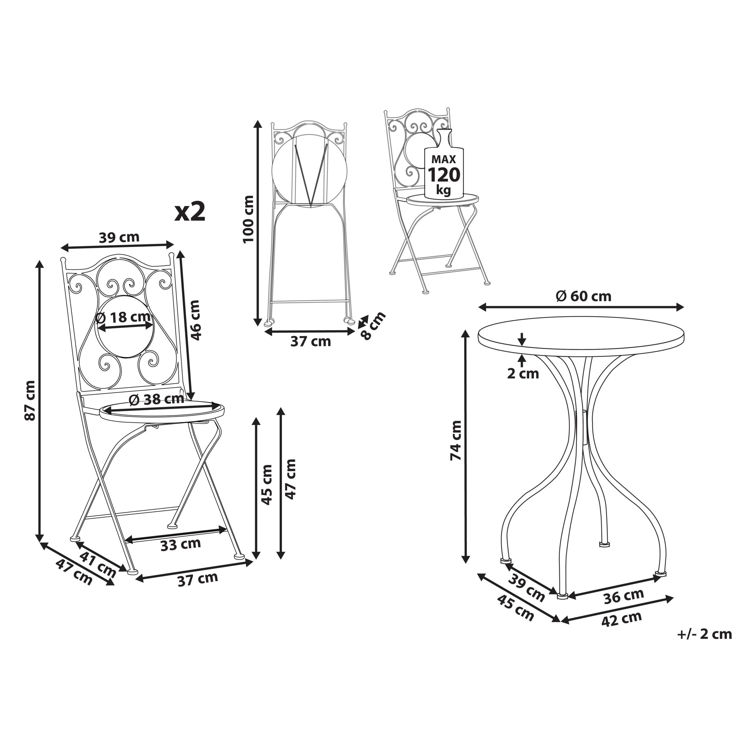 Mosaiikkikuvioidut pöytä ja tuolit puutarhaan. Tämä 2-istuttava setti, joka sisältää bistropöydän ja yhteensopivat taittotuolit, on täydellinen valinta mihin tahansa puutarhaan tai parveekkelle, tuoden ulkotilaan ripauksen välimerellistä tyyliä. Tukevat rautarungot takaavat kestävyyden, ja viehättävät mosaiikkikuvioidut keraamiset istuimet ja pöytälevy korostavat niiden kauneutta. Ajattoman muotoilunsa ja kompaktin kokonsa ansiosta setti sopii erinomaisesti pienempiin tiloihin ja täydentää vaivattomasti mitä tahansa sisustusta.