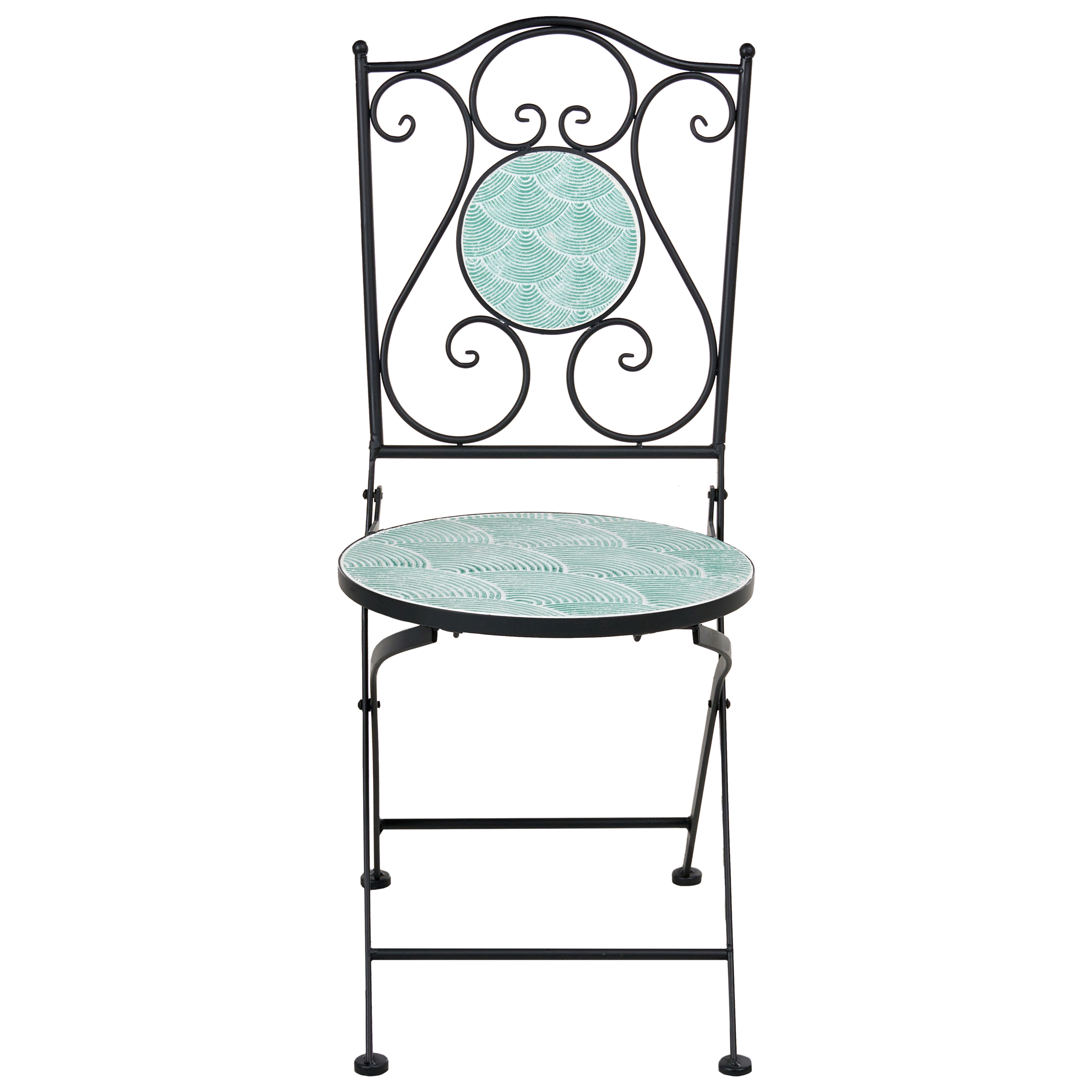 Vintage-tyylinen pieni puutarhasetti. Lisää puutarhaan tai parvekkeelle ripaus raikasta, välimerellistä tunnelmaa tällä retrotyylisellä bistrosetillä, joka sisältää kaksi tuolia ja pyöreän pöydän. Keraamisella pinnalla viimeisteltyjä istuimia, selkänojia ja pöytälevyä koristaa aaltoileva geometrinen kuvio, joka antaa kalusteille kevyen, modernin ilmeen ja luo rauhallisen ja kutsuvan ilmapiirin. Kestävästä raudasta valmistetut rungot takaavat vakauden ja lujuuden. Kompaktin koon ja tuolien kokoontaitettavan rakenteen ansiosta setti sopii täydellisesti myös pieniin ulkotiloihin, yhdistäen tyylin ja käytännöllisyyden.