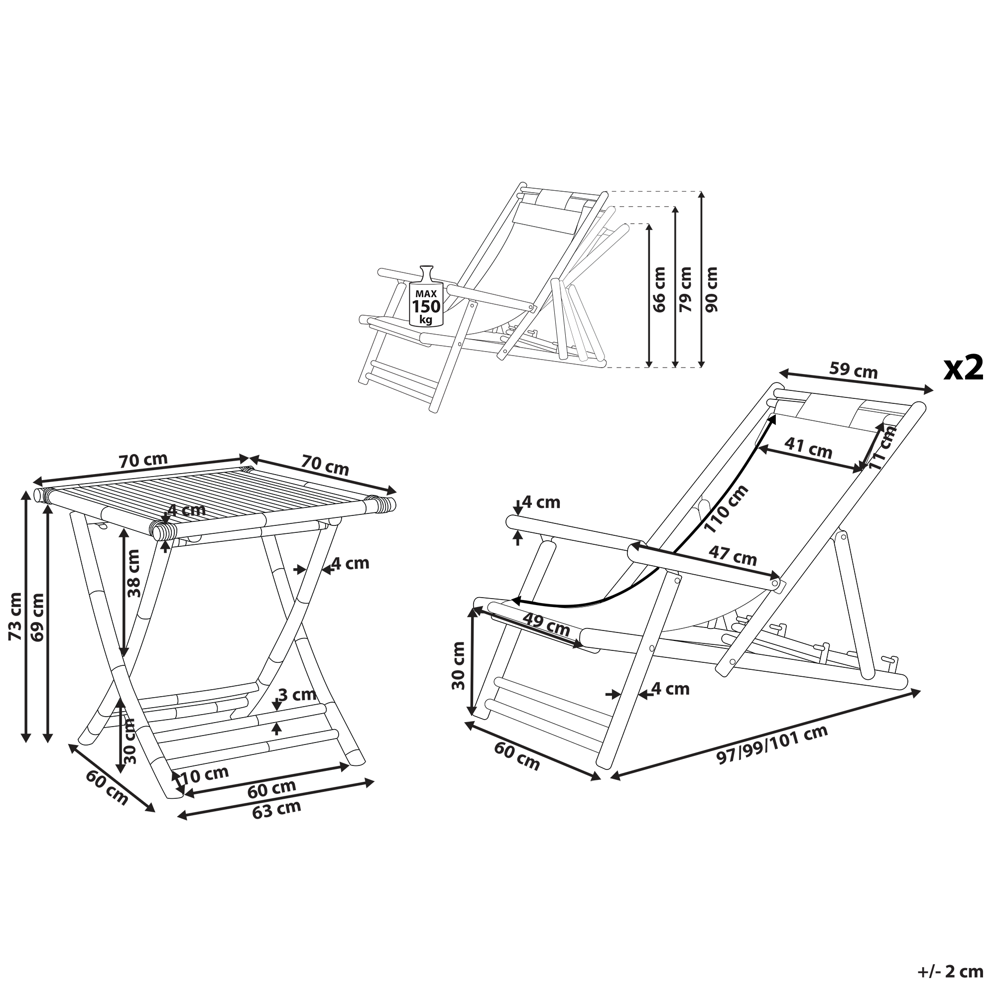 Ominaisuudet: Selkänoja säädettävissä kolmeen eri asentoon, Puun luonnolliset syykuviot tekevät jokaisesta kappaleesta ainutlaatuisen, Tukeva runko, Suojattava vedeltä ja sateelta laadun säilyttämiseksi, UV-kestävyys 6 (ISO 105-B02), Kokoontaitettuna säästää tilaa