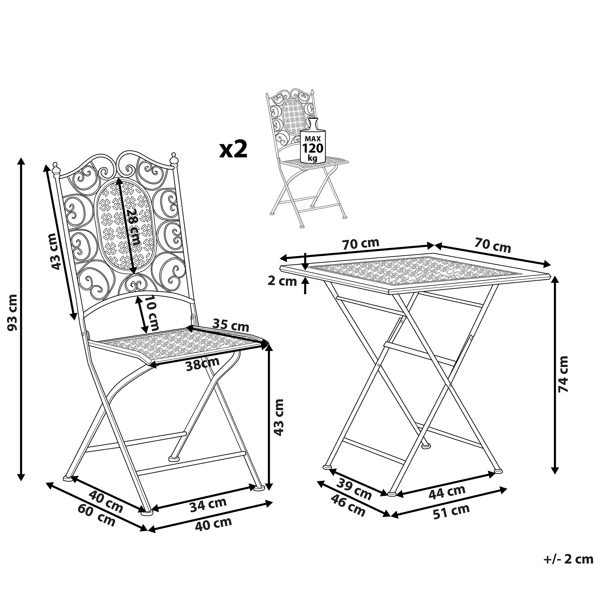 Taitettava parvekesetti kahdelle. Tuo parvekkeellesi romanttista tunnelmaa ja nauti auringosta tämän ihastuttavan, vintage-tyylin inspiroiman bistrosetin ääressä. Laadukkaasta ja kestävästä jauhemaalatusta raudasta valmistetut kalusteet kestävät vuosien käytön. Kokoontaitettavan ominaisuutensa ansiosta pöytä ja tuolit on helppo taittaa kasaan varastointia varten ja niitä on helppo siirrellä paikasta toiseen. Ainutlaatuinen kuviointi, avonainen muotoilu ja kulunut viimeistely saavat bistrosetin sopimaan moniin erilaisiin ulkosisustuksiin, tuoden niihin retrohenkeä.