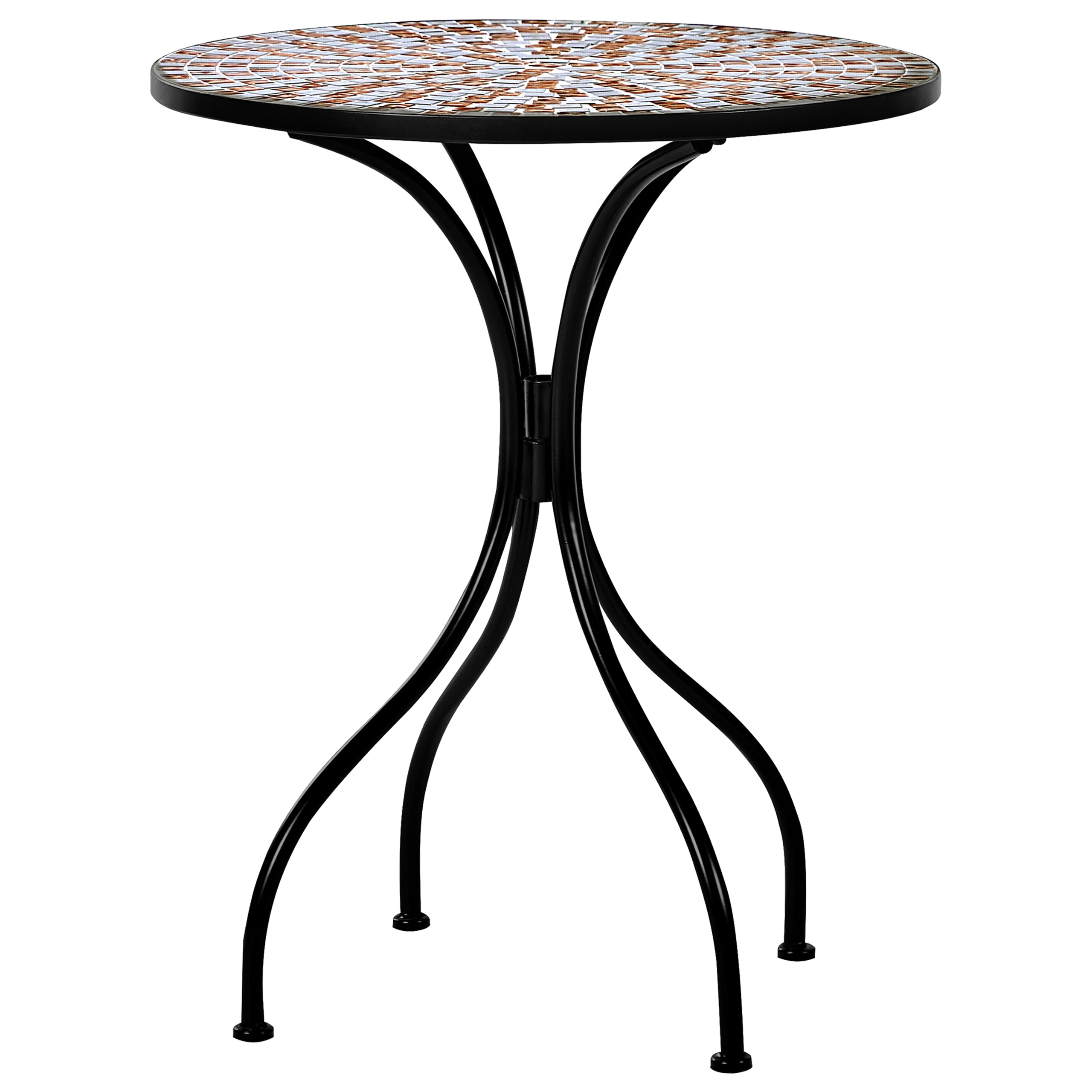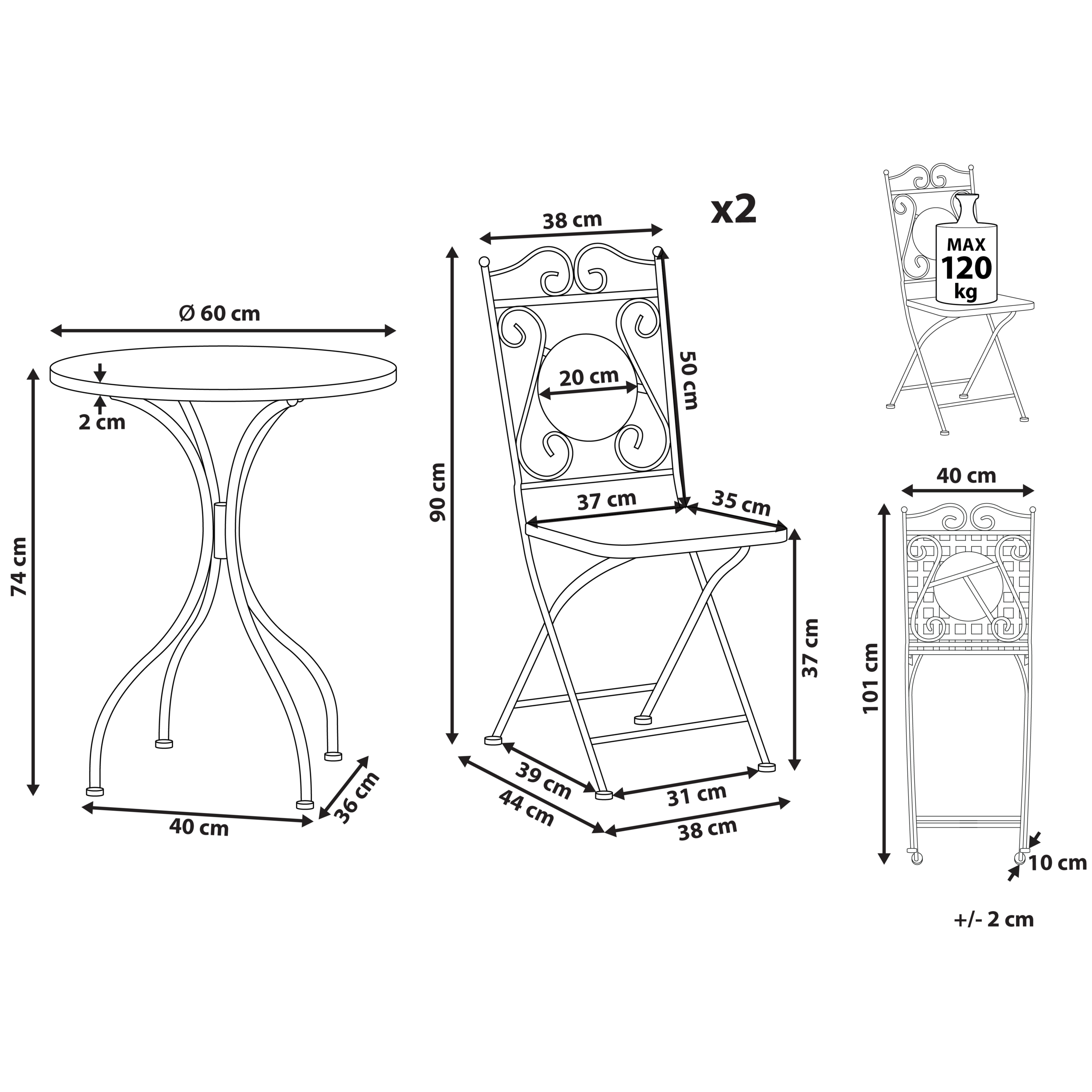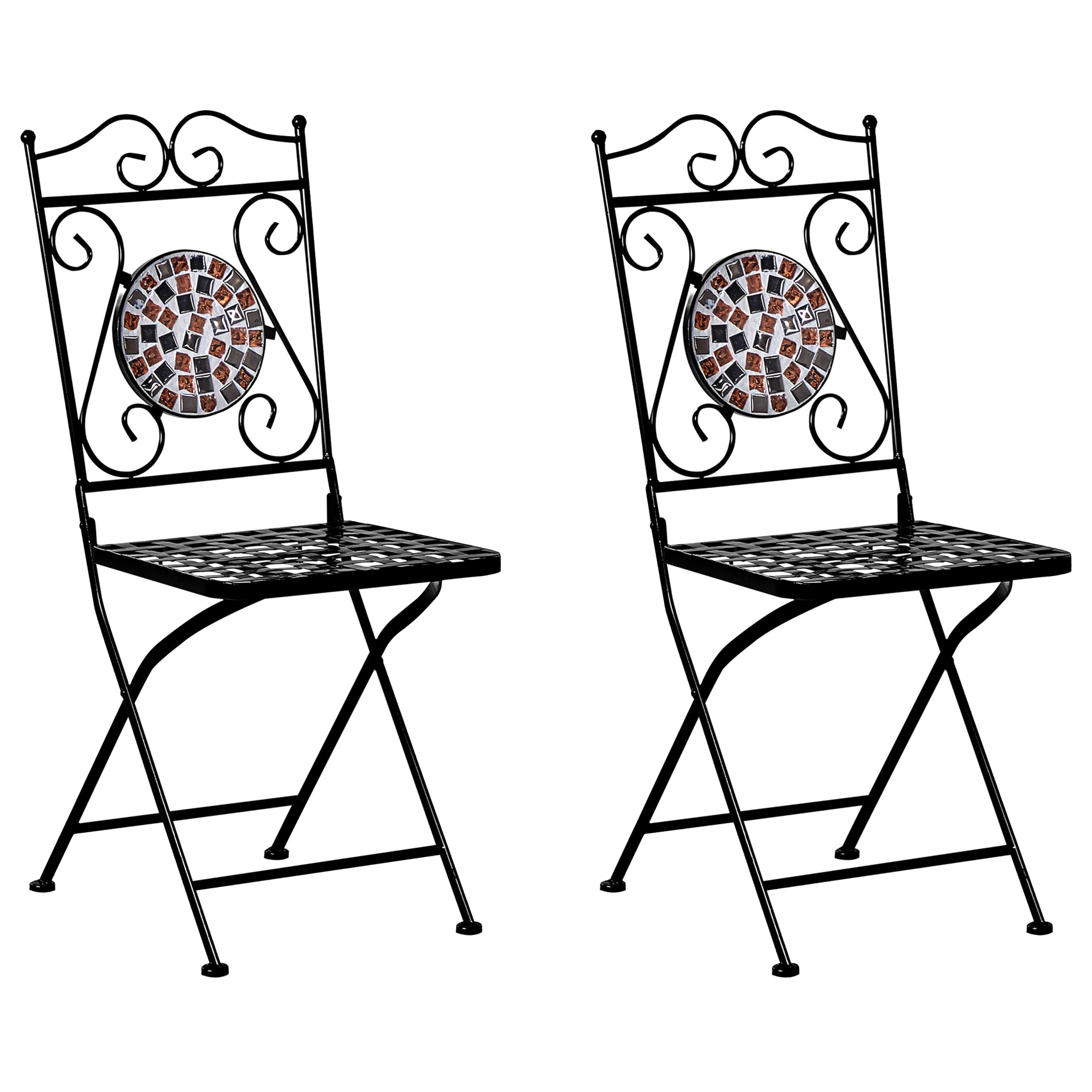 Retro parvekesetti mosaiikkikuvioinnilla. Kohota ulkotilaasi tällä koristeellisella, tyyliä ja toiminnallisuutta yhdistävällä bistrosetillä, joka on valmistettu kestävästä raudasta. Siinä on upea, sementtiin asetetuista mustista ja kultaisista lasilaatoista koostuva mosaiikkikuvio, joka tuo settiin ripauksen vintage-viehätystä. Setti sopii täydellisesti intiimeihin kokoontumisiin ystävän kanssa, ja sen retroestetiikka parantaa vaivattomasti mitä tahansa puutarhaa, parveketta tai terassia. Jaloissa olevat muovitapit suojaavat pintoja naarmuilta. Tuolit ovat kokoontaitettavissa helpon varastoinnin takaamiseksi.