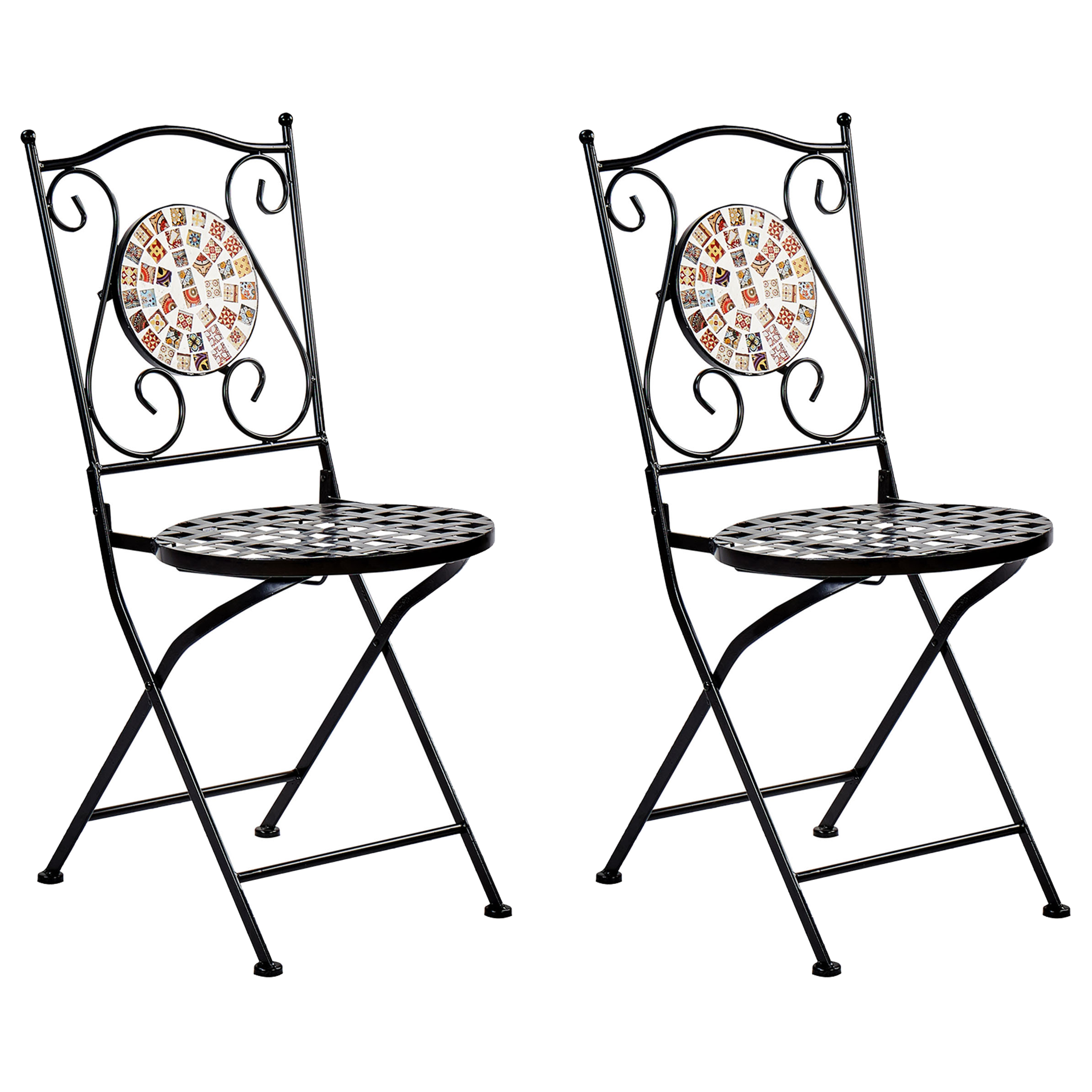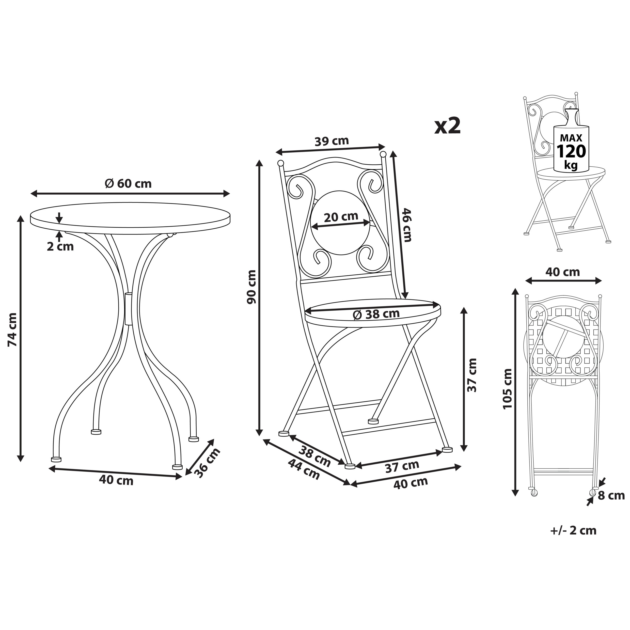 Retro puutarhasetti mosaiikkikuvioinnilla. Tuo ulkotilaasi välimerellistä tunnelmaa tällä ihastuttavalla kahden istuttavalla bistrosetillä. Kestävästä raudasta valmistetuissa pöydässä ja tuoleissa on värikkäistä lasilaatoista ja sementistä valmistettu mosaiikkikuvio, joka tuo settiin eloisaa ja taiteellista ilmettä. Setti tarjoaa loistavan paikan intiimeille illallisille ystävän tai puolison kanssa. Retromuotoilu rikastuttaa mitä tahansa puutarhaa, parveketta tai terassia ainutlaatuisella viehätyksellään. Jalkojen muovitapit suojaavat pintoja naarmuilta, ja kokoontaitettava ominaisuus tekee tuolien varastoinnista helppoa.