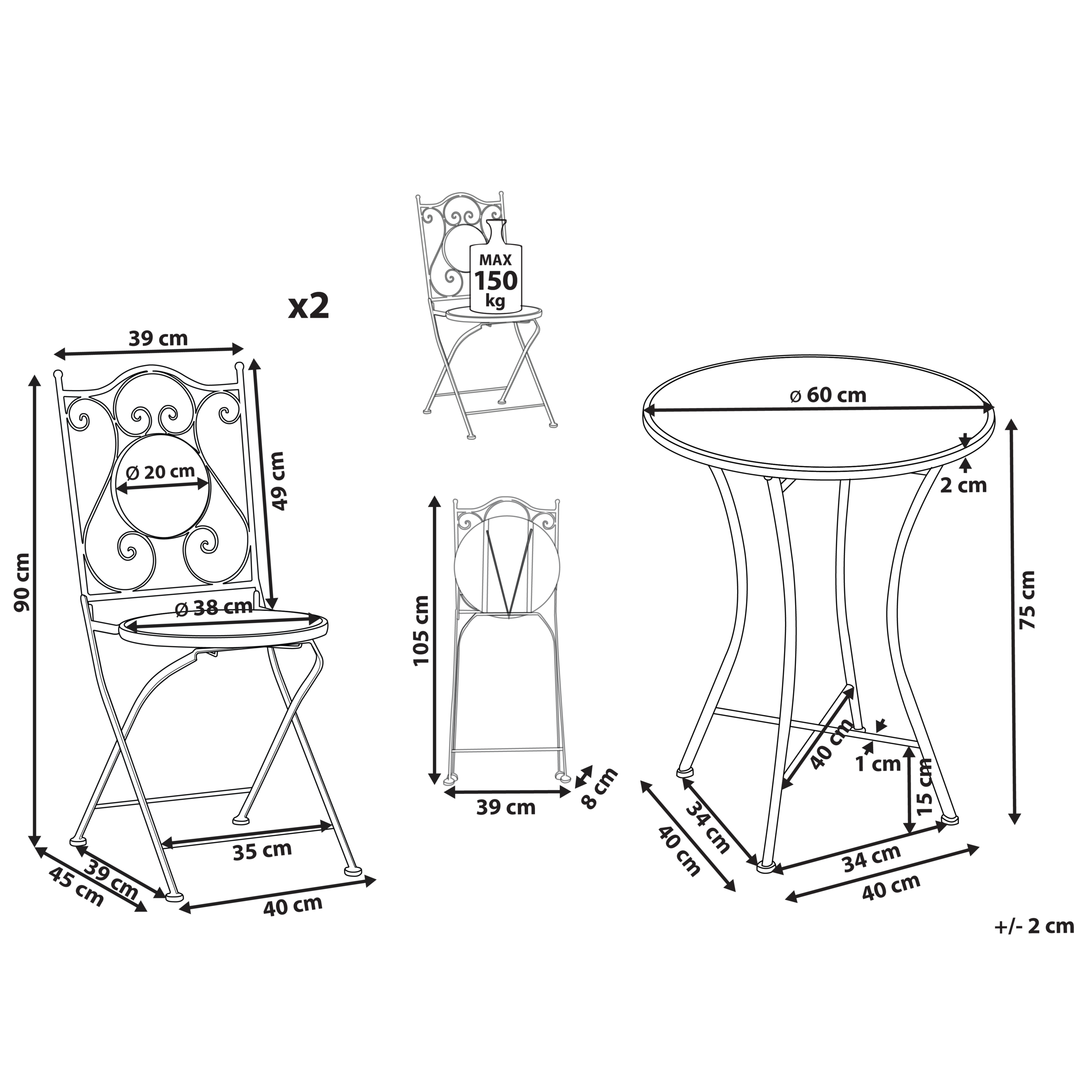 Vintage-tyylinen parvekesetti mosaiikkikuviolla. Lisää puutarhaasi, parvekkeellesi tai terassillesi väriä ja eleganssia tällä näyttävällä bistrosetillä, jossa on pyöreä pöytä ja taittotuolit. Tukevasta raudasta valmistetuissa rungoissa on e-pinnoite – sähkökemiallinen pintakäsittely, joka suojaa ruosteelta ja korroosiolta. Tämän ansiosta ne kestävät vaihtelevia sääolosuhteita ja säilyttävät viehättävän ulkonäkönsä ajan myötä. Eloisalla mosaiikkikuviolla koristellut keraamiset pinnat tuovat koristeellista tunnelmaa. Kestävä ja vähän huoltoa vaativa setti on tyylikäs ja käytännöllinen lisä jokaiseen ulkotilaan, tarjoten täydellisen paikan aamukahville tai romanttiselle illalliselle.