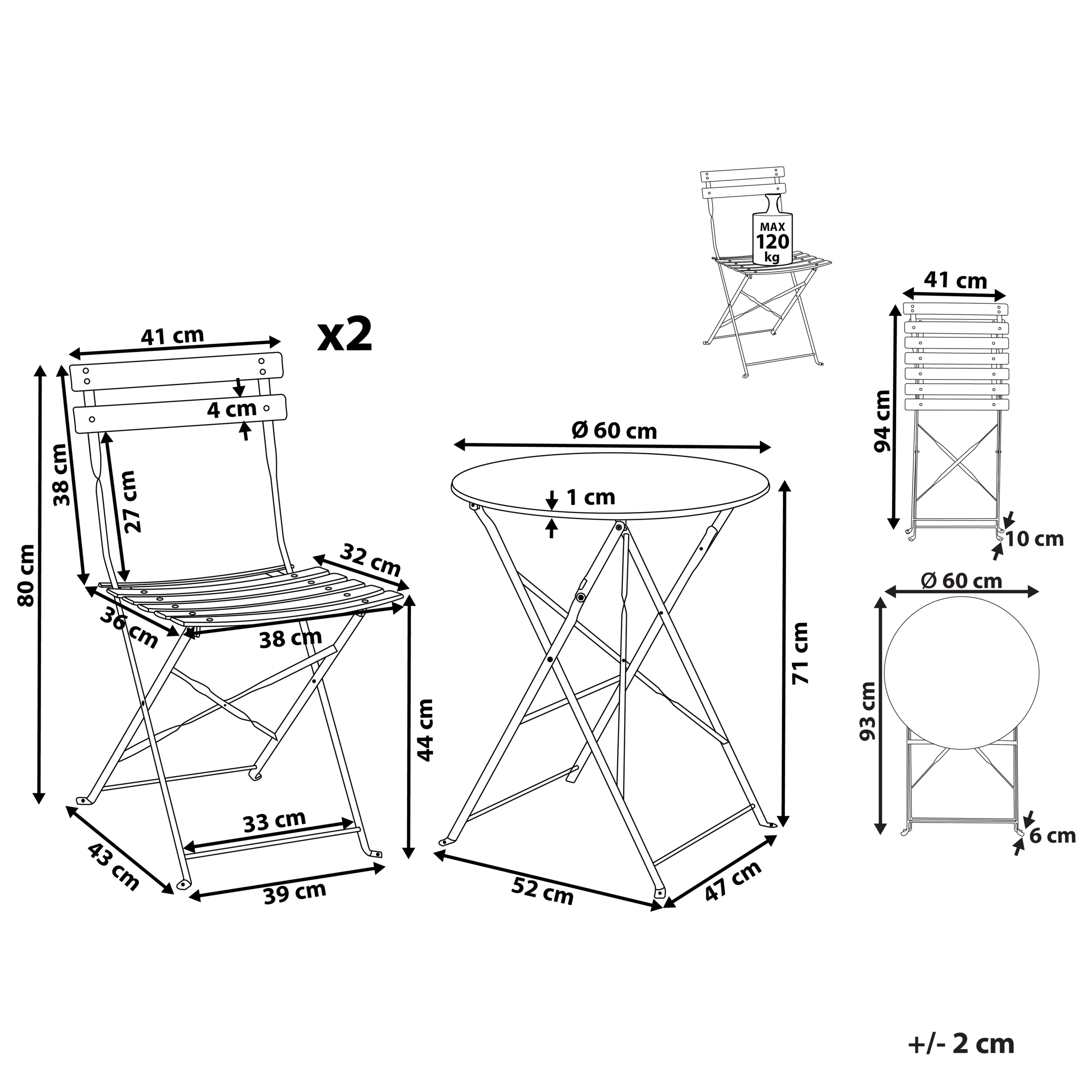 Moderni kokoontaitettava parvekesetti. Tämä tyylikäs bistrosetti on täydellinen lisä minkä tahansa tyyliselle parvekkeelle tai puutarhaan. Kahdesta tuolista ja käytännöllisestä puutarhapöydästä koostuva setti on valmistettu vankasta ja kestävästä teräksestä, joten ne näyttävät hyvältä vuosien ajan. Keveytensä ja kokoontaitettavan ominaisuutensa ansiosta parvekesettiä on helppo siirtää paikasta toiseen ja varastoida käyttökauden loputtua. Luo hurmaava tila ulkotilaasi ja nauti aamupalasta tai lounaasta rentoutuen tämän bistrosetin äärellä.