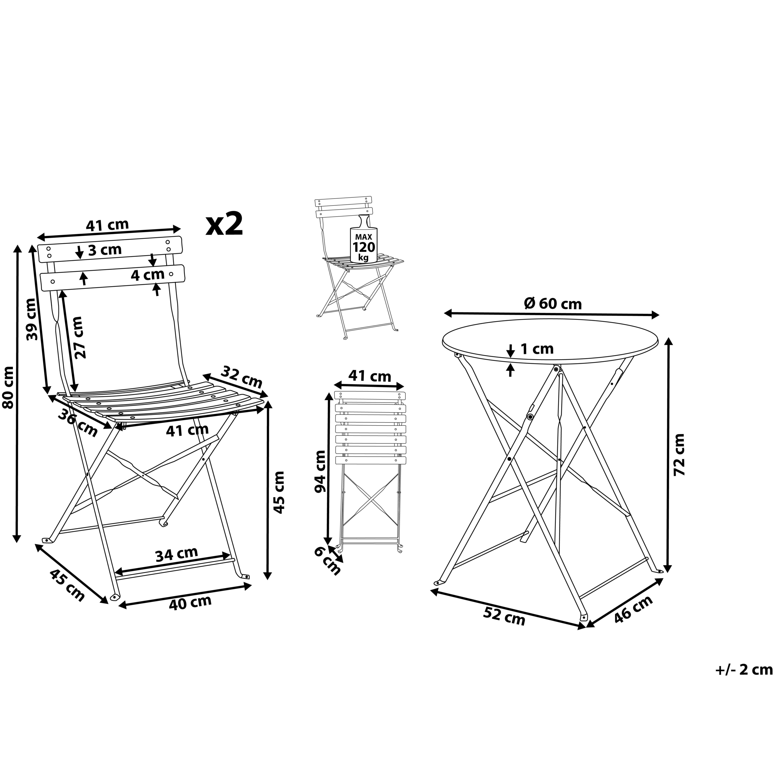 Moderni kokoontaitettava parvekesetti. Tämä tyylikäs bistrosetti on täydellinen lisä minkä tahansa tyyliselle parvekkeelle tai puutarhaan. Kahdesta tuolista ja käytännöllisestä puutarhapöydästä koostuva setti on valmistettu vankasta ja kestävästä teräksestä, joten ne näyttävät hyvältä vuosien ajan. Keveytensä ja kokoontaitettavan ominaisuutensa ansiosta parvekesettiä on helppo siirtää paikasta toiseen ja varastoida käyttökauden loputtua. Luo hurmaava tila ulkotilaasi ja nauti aamupalasta tai lounaasta rentoutuen tämän bistrosetin äärellä.