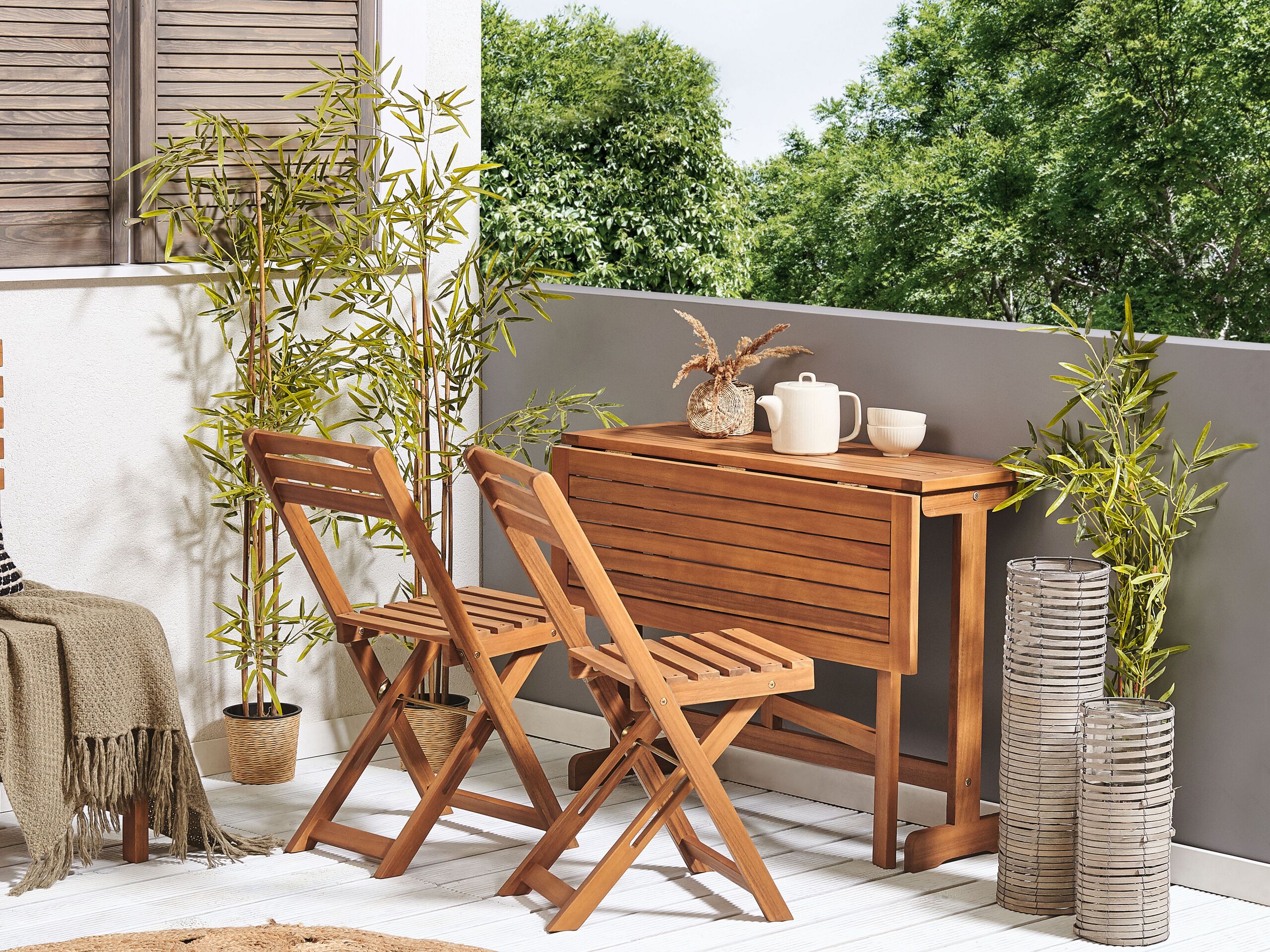 2 tuolia ja jatkettava pöytä ulkokäyttöön. Kapea parveke vaatii luovia ratkaisuja kalusteiden suhteen. Tämä käytännöllinen bistrosetti sisältää jatkettavan pöydän ja kokoontaitettavat tuolit, joten sen saa säilöttyä pieneenkin tilaan. Akaasiasta valmistetut kalusteet ovat kestäviä ja pitkäikäisiä. Luonnollisen sävynsä ansiosta ne ovat ajattoman tyylikäs vaihtoehto mihin tahansa sisustukseen. Säädä puutarhapöytää tarpeidesi mukaan ja nauti kupillisesta teetä tai illallisesta sen ääressä.
