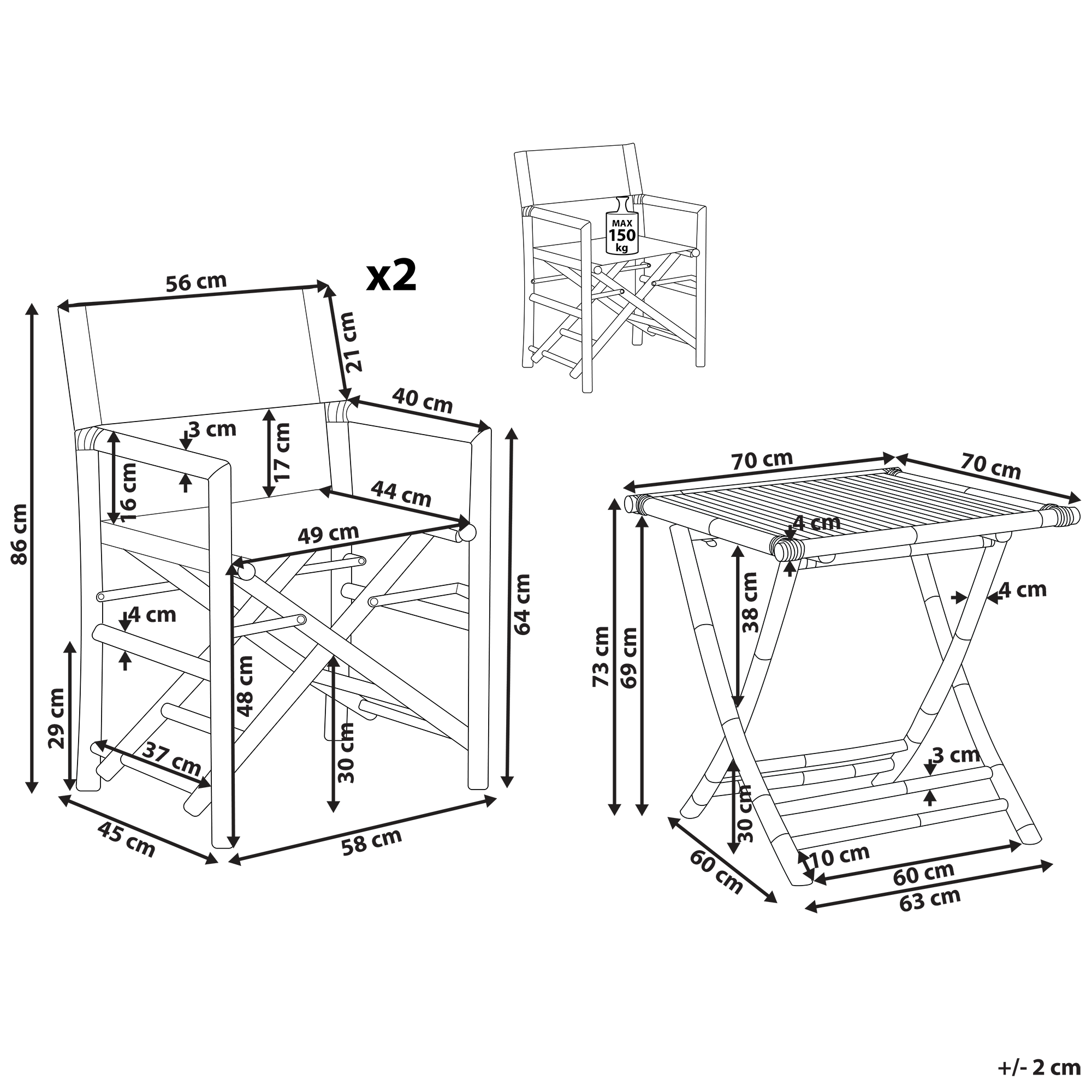 Kokoon taittuvat ohjaajantuolit ja pieni pöytä. Tuo puutarhaasi tai parvekkeellesi rustiikkista retrotunnelmaa tällä upealla bistrosetillä. Se on valmistettu kestävästä bambusta, jonka luonnollinen ilme sopii täydellisesti sekä luonnonläheisiin että boho-tyylisiin sisustuksiin. Tuolien istuimet on valmistettu UV-säteilyn kestävästä polyesterikankaasta, jonka ansiosta ne ovat erittäin mukavat istua. Puutarhatuolien muotoilu on saanut inspiraationsa ohjaajantuoleista. Kalusteet ovat kokoontaitettavissa, joten ne ovat helppoja säilöä tai ottaa mukaan. Aseta bistrosetti ulos ja nauti aamuauringosta lämmintä juomaa siemaillen.