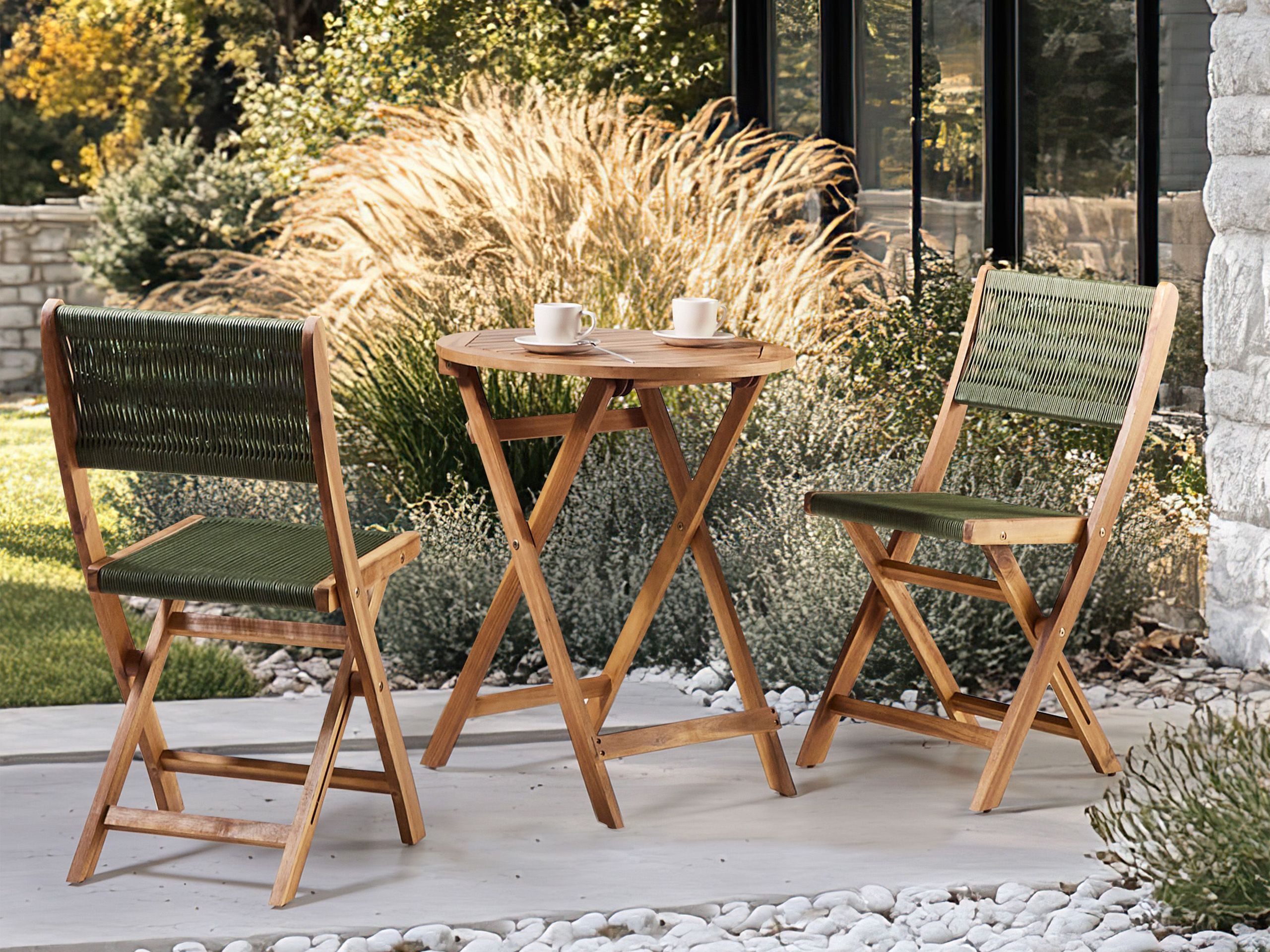 Taitettava kahvilaryhmä ulkokäyttöön. Tämä bistrosetti, joka koostuu pyöreästä pöydästä ja kahdesta yhteensopivasta tuolista, on täydellinen lisä mihin tahansa puutarhaan, terassille tai parvekkeelle. Tukevasta akaasiapuusta valmistettu setti takaa vakauden ja kauniin luonnollisen ilmeen. Tuolien vihreät köysipunotut selkänojat sekä istuimet tarjoavat niin mukavuutta kuin tyyliä. Kokoontaitettavan rakenteensa ansiosta setti on kätevä säilyttää vuodenaikojen vaihtuessa, ja sen klassinen ilme sulautuu erinomaisesti moniin ympäristöihin.