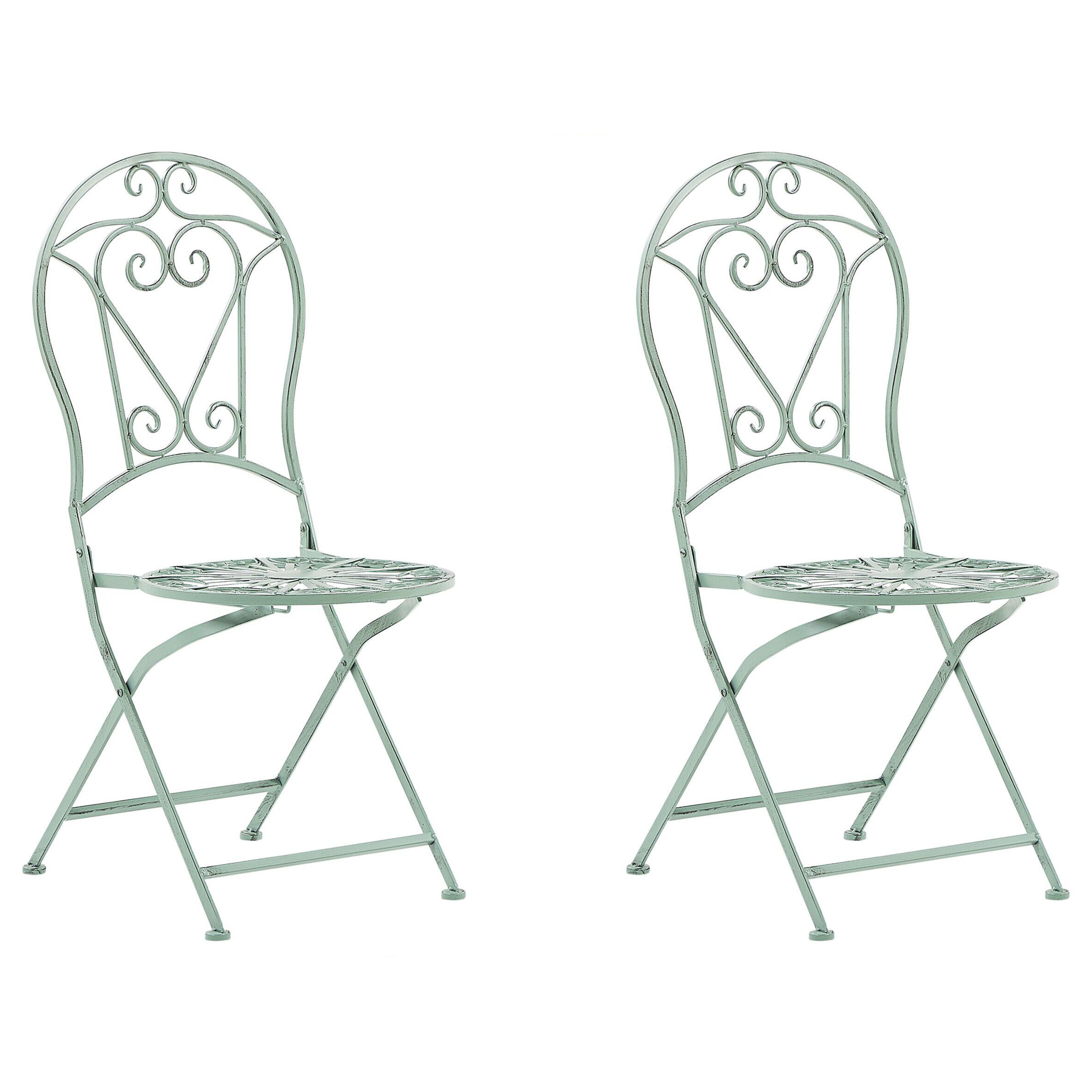 Puutarhapöytä ja 2 tuolia. Tuo romanttista tunnelmaa ulkotilaasi. Kokonsa ansiosta tämä bistrosetti sopii täydellisesti sekä puutarhaan että parvekkeelle tarjoten suloisen istumapaikan kahdelle. Vaaleanvihreäksi jauhemaalatusta raudasta valmistetut tuolit ja pöytä on viimeistelty kauniilla kuluneella efektillä ja filigraanikuvioilla, jonka ansiosta ne sopivat loistavasti kasvien valtaamiin, vintage-tyylisiin ulkosisustuksiin. Kalusteet ovat kokoontaitettavissa, joten ne ovat helposti säilytettävissä silloin kun ne eivät ole käytössä. Luo intiimi keskustelupaikka ulkotilaasi ja nauti raikkaasta ulkoilmasta ja auringosta.