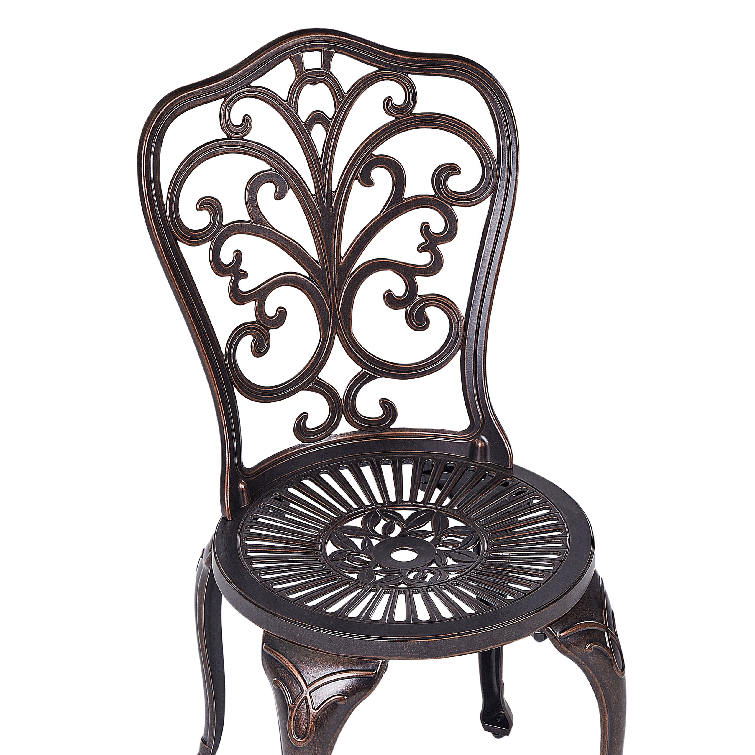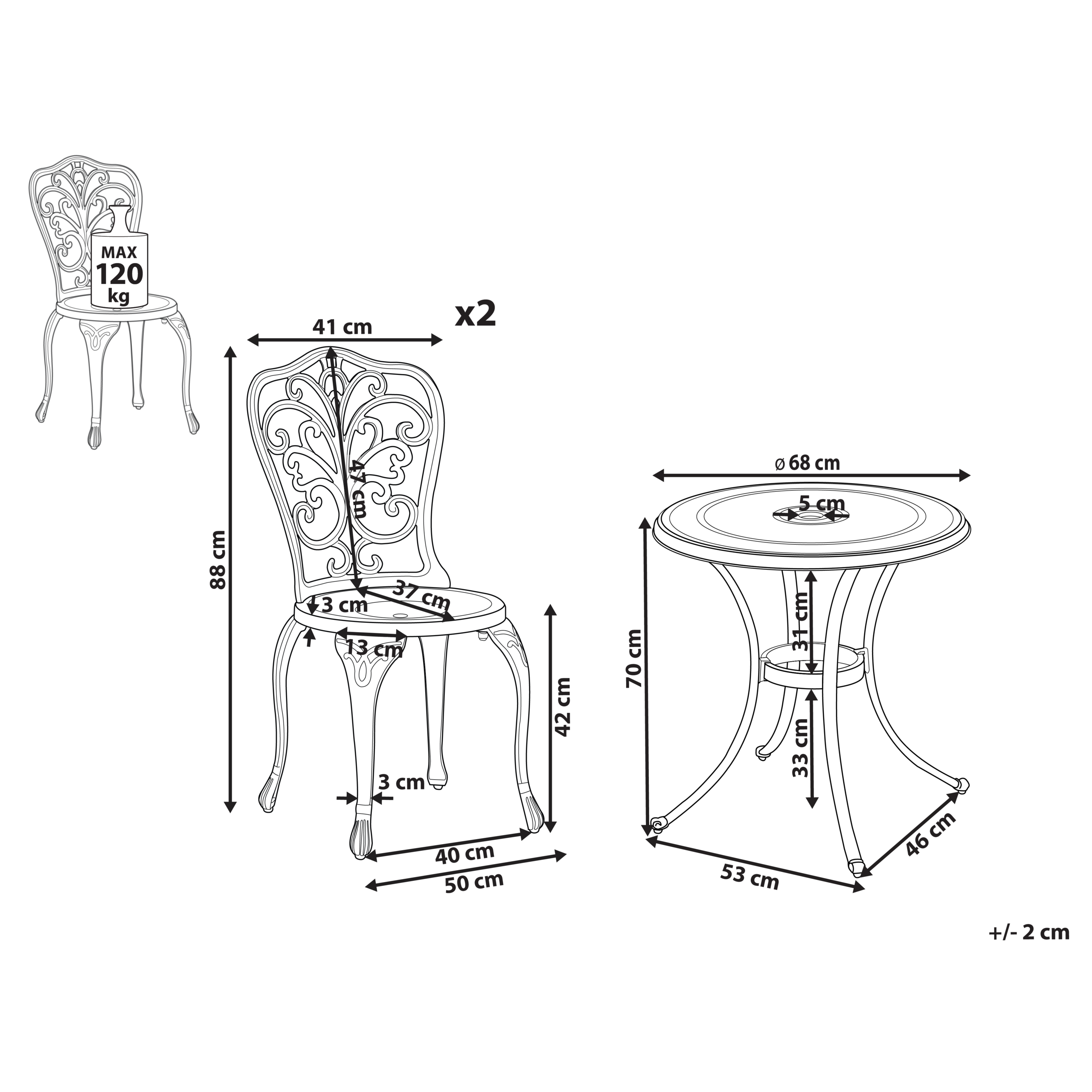 Vintage-tyylinen pieni puutarhasetti. Vintage-tyylin inspiroima bistrosetti sisältää kaksi tuolia ja pyöreän pöydän, jotka sopivat niin puutarhaan, terassille kuin parvekkeellekin. Kalusteet on valmistettu kevyestä mutta kestävästä alumiinista, ja niiden jauhemaalattu viimeistely takaa pitkäikäisen laadun. Selkänojien ja pöytälevyn kaunis kuviointi luo retrohenkisen vaikutelman, joka täydentää hennosti kaartuvia jalkoja ja pyöreitä muotoja. Lisäksi pöytälevyssä on kätevä reikä aurinkovarjolle. Lisää bistrosetti mihin tahansa ulkotilaan luodaksesi hurmaavan paikan aamukahvin tai intiimin illallisen nauttimiseen.