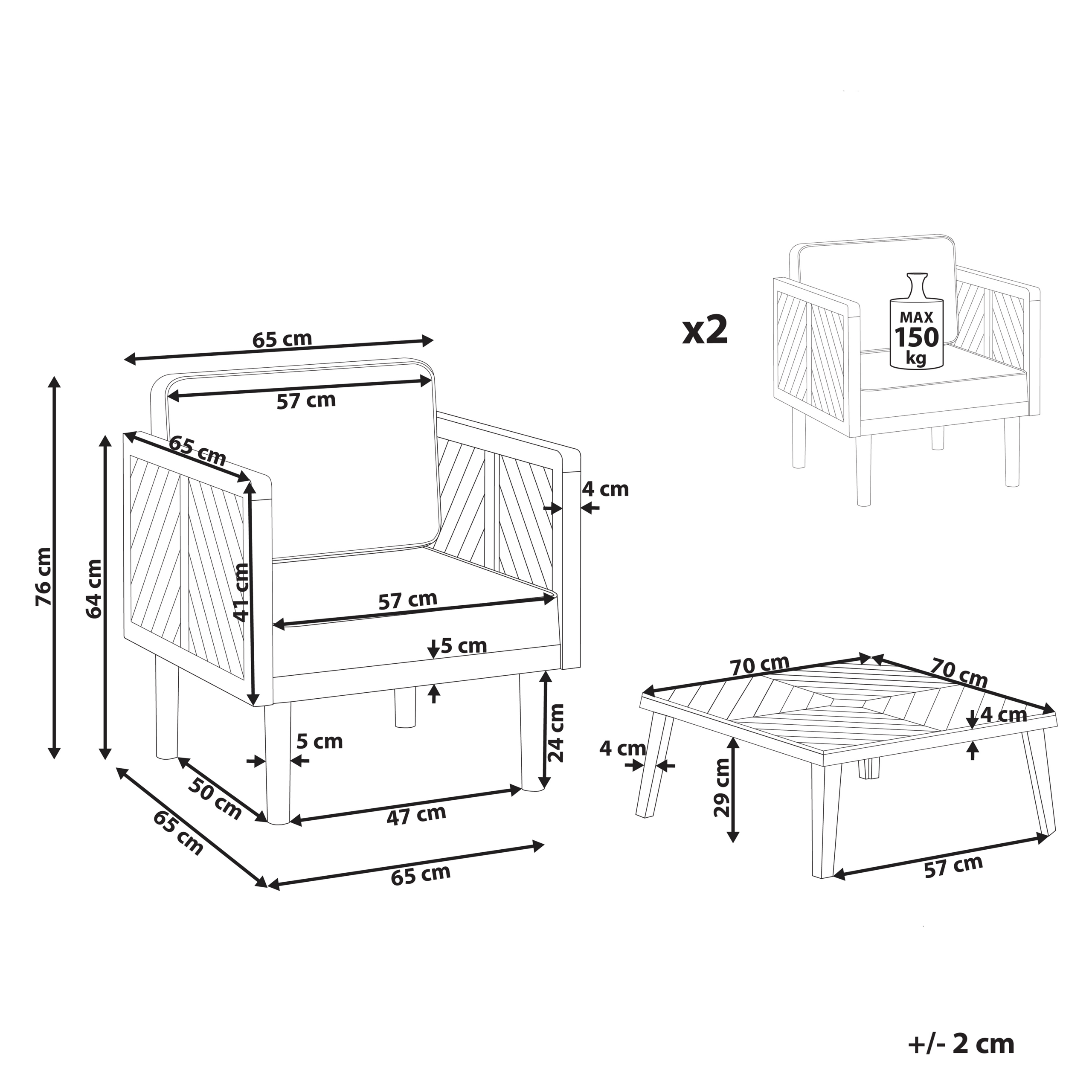Modernit puutarhatuolit ja sohvapöytä. Luo rustiikkinen ja mukava oleskelutila terassille tällä bistrosetillä. Kahdesta nojatuolista ja sohvapöydästä koostuva kalusteryhmä tarjoaa tilaa kahdelle hengelle. Korkealaatuisesta ja kestävästä akaasiasta valmistetut vankat kalusteet tuovat tilaan luonnollista ilmettä. Mukana tulevat paksut pehmusteet takaavat mukavuuden ja oikeanlaisen tuen. Neutraalien väriensä ansiosta ne sulautuvat loistavasti useisiin erilaisiin sisustuksiin. Nauti kesäisistä keleistä ja ulkoilmasta tässä nykyaikaisessa setissä istuskellen.