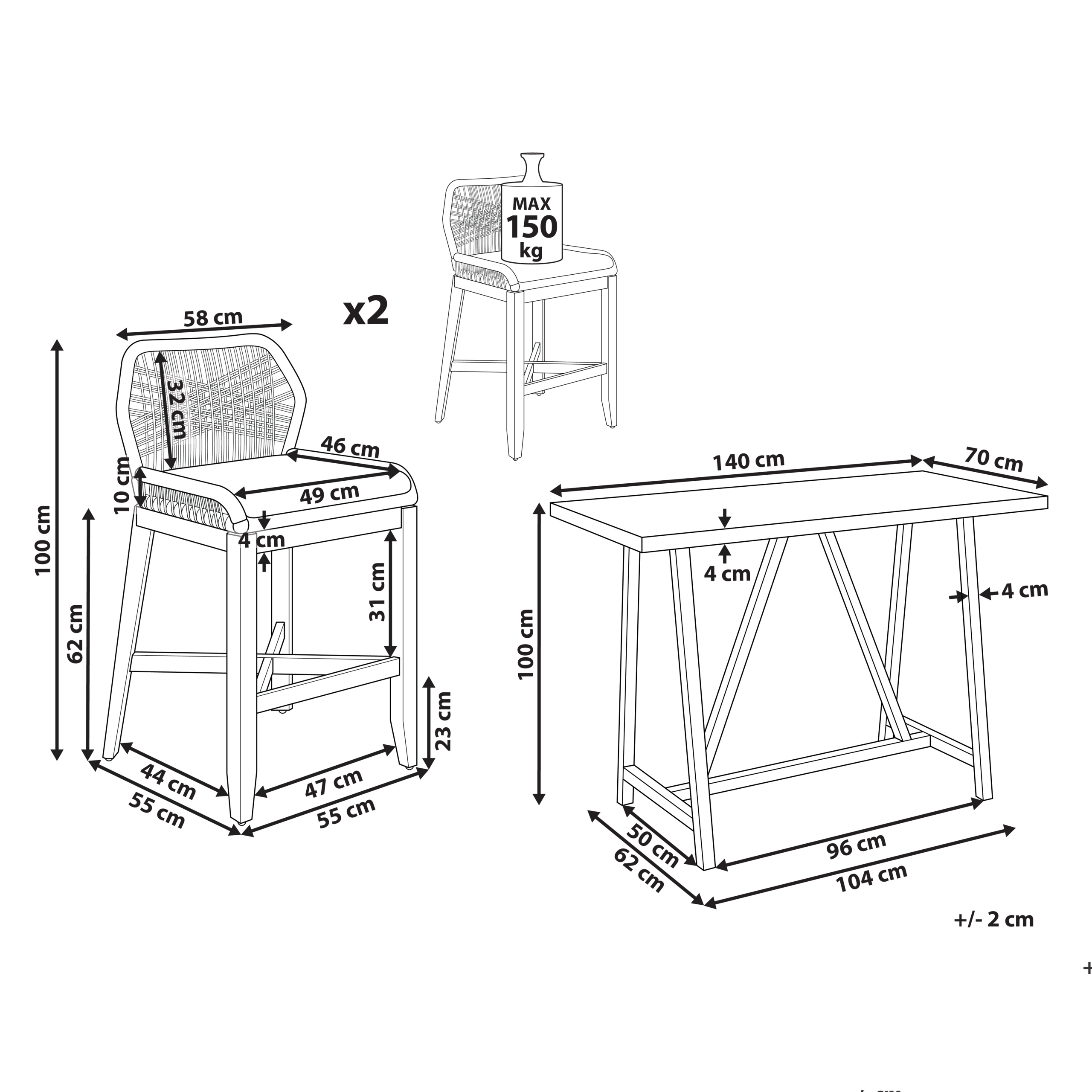 Tyylikäs korkean pöydän ja baarituolien setti. Piristä terassiasi tai parvekettasi tällä tyylikkäällä, industriaalisen tyylisellä bistrosetillä, joka sisältää kaksi baarituolia ja korkean pöydän. Kalusteiden jalat on valmistettu vaaleasta akasiapuusta, mikä lisää charmia ja lämpöä setin yleisilmeeseen. Selkänojien ainutlaatuinen köysipunos tarjoaa tukea ja lisää visuaalista tekstuuria, kun taas polyesteri-istuimet varmistavat istumamukavuuden. Suorakulmainen pöytälevy on valmistettu harmaasta kuitusementistä. Bistrosetti luo ulkotilaan harmonisen ja kutsuvan kokonaisuuden, jonka äärellä voit nauttia ulkoilmasta ja hyvästä seurasta.