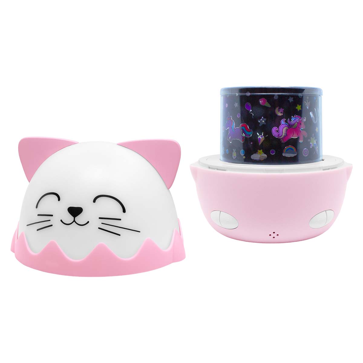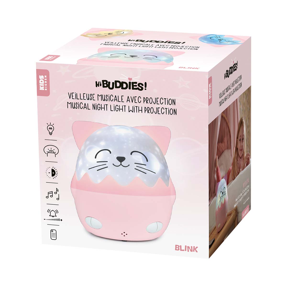 Hi Buddies Chat Bluetooth -musiikki-yövalo saa lapsesi uppoutumaan rauhoittavaan ilmapiiriin 360°-projektioiden ja 8 rentouttavan melodian ansiosta. Valaisimessa on erilaisia taustoja, kuten avaruus ja yksisarviset, sekä erilaisia valotehosteita. Se on ladattavissa USB-C:n kautta, ja siinä on 15-60 minuutin ajastin, säädettävä äänenvoimakkuus sekä valon ja musiikin ON OFF-tila.