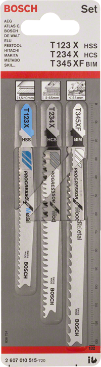 Kolmen huippuluokan Progressor-terän sarja. Progressiivinen hammastus mahdollistaa sekä ohuen että paksun materiaalin leikkaamisen samalla terällä. Sisältää terät puulle, metallille ja yleiskäyttöön.