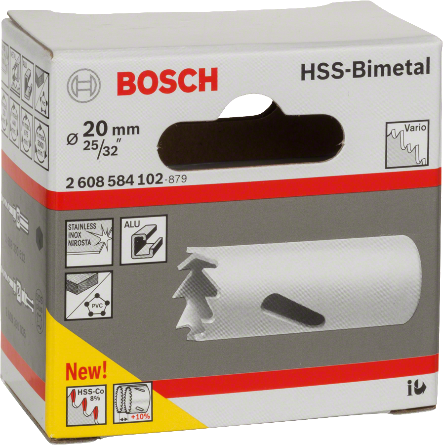 Pieni 20 mm bimetallireikäsaha. Progressiivinen hammasjako takaa nopean etenemisen ja tehokkaan lastunpoiston. Sopii kaapelinläpivienteihin ja pienten putkien asennukseen.