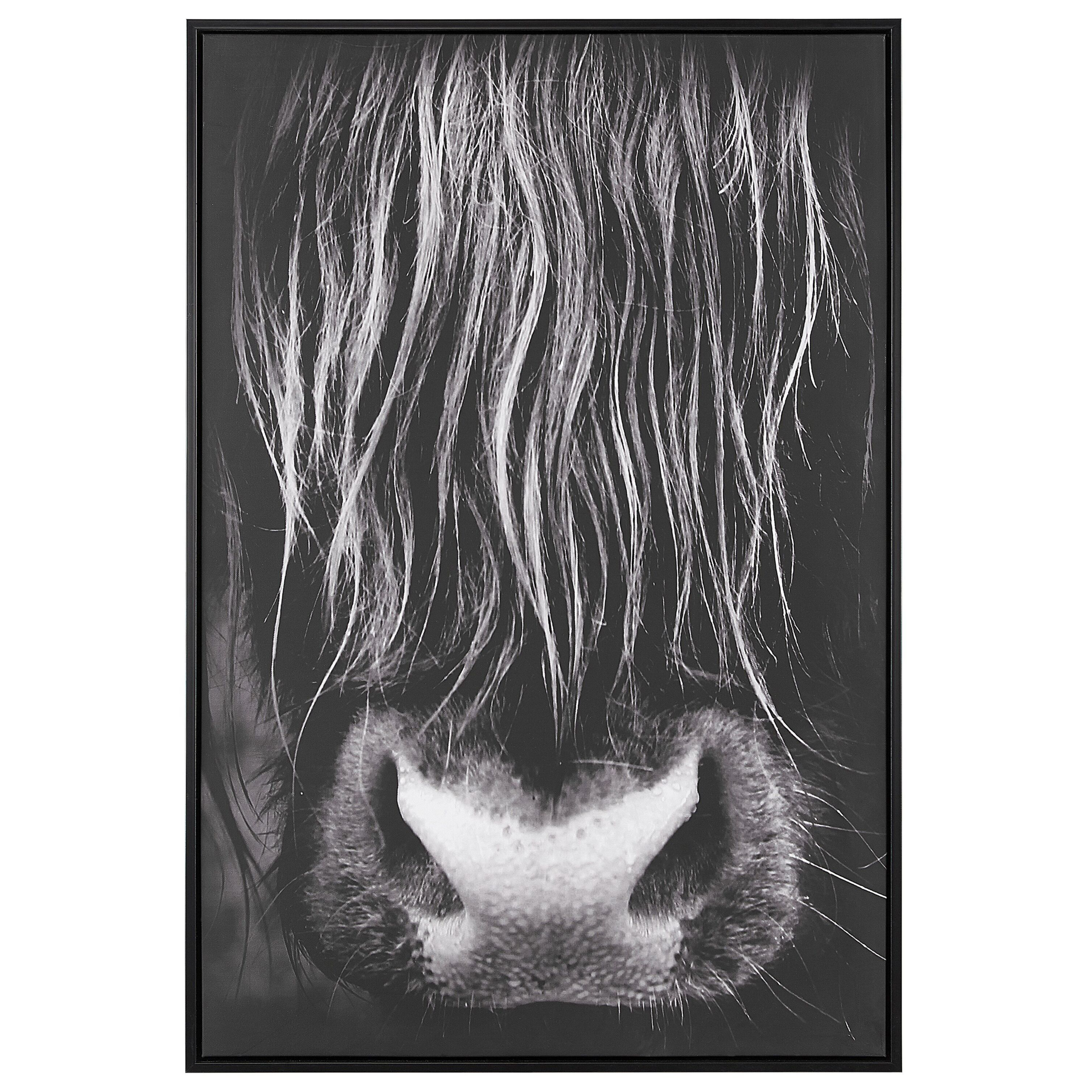 Kehystetty lehmä-aiheinen taulu. Tämä tummansävyinen canvas-taulu on täydellinen lisä industriaaliseen tai moderniin sisustukseen. Muiden taulujen tai valokuvien joukkoon ripustettuna se toimii varmasti minkä tahansa kalustekokonaisuuden kohottajana. Korkealaatuisella printillä painettu kangas on asetettu yhteensopivaan kelluvaan kehykseen, jonka takana on kaksi kätevää ripustuskoukkua.