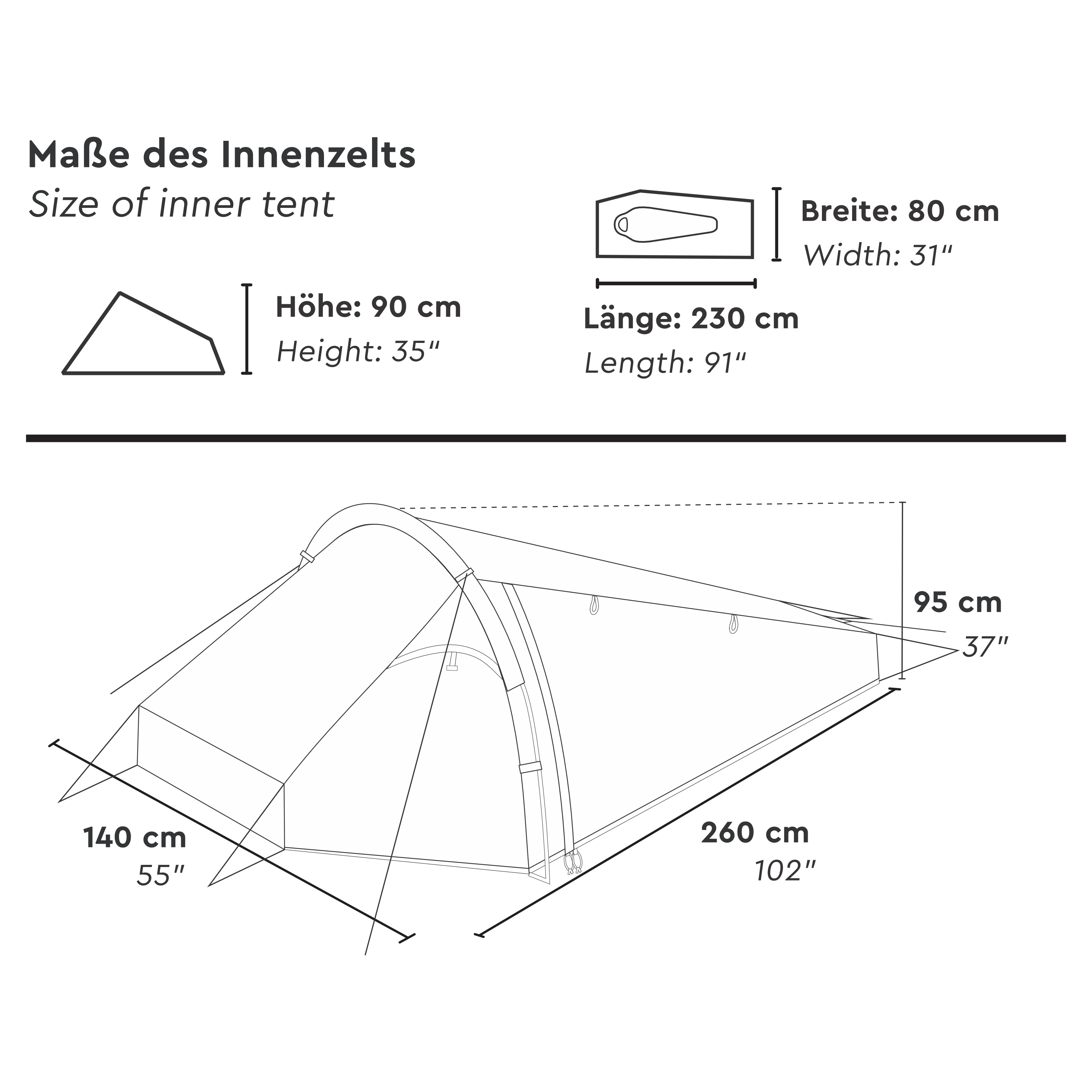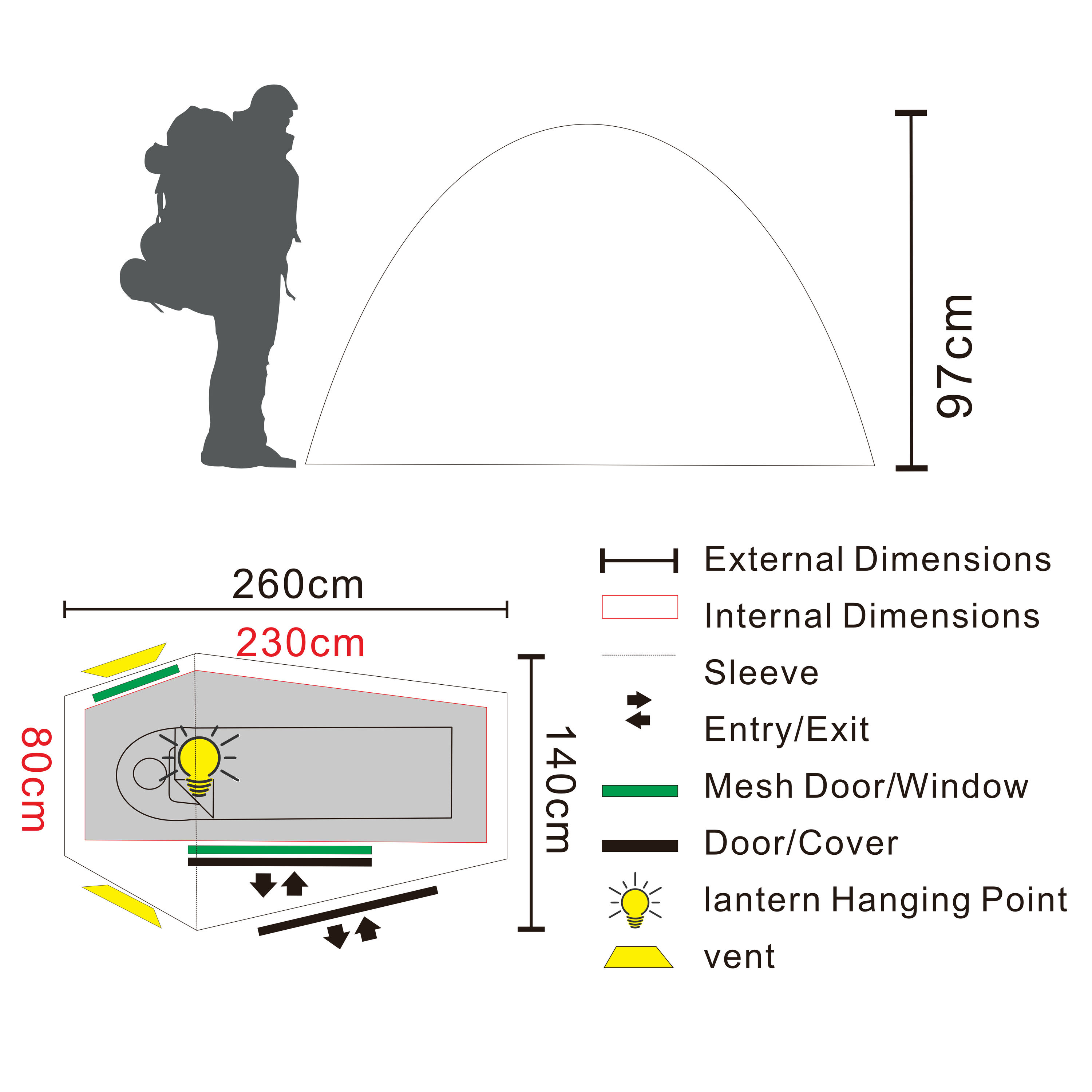 Ulkoteltan mitat ovat noin 260 × 140 × 95 cm (P × L × K), ja taaksepäin laskeva siluetti tekee teltasta aerodynaamisen. Muoto vähentää tuulen vastuspintaa ja säästää samalla painoa. Sisäteltan mitat ovat noin 230 × 80 × 90 cm, tarjoten riittävästi tilaa yhdelle hengelle ja varusteille ilman turhaa lisäpainoa.