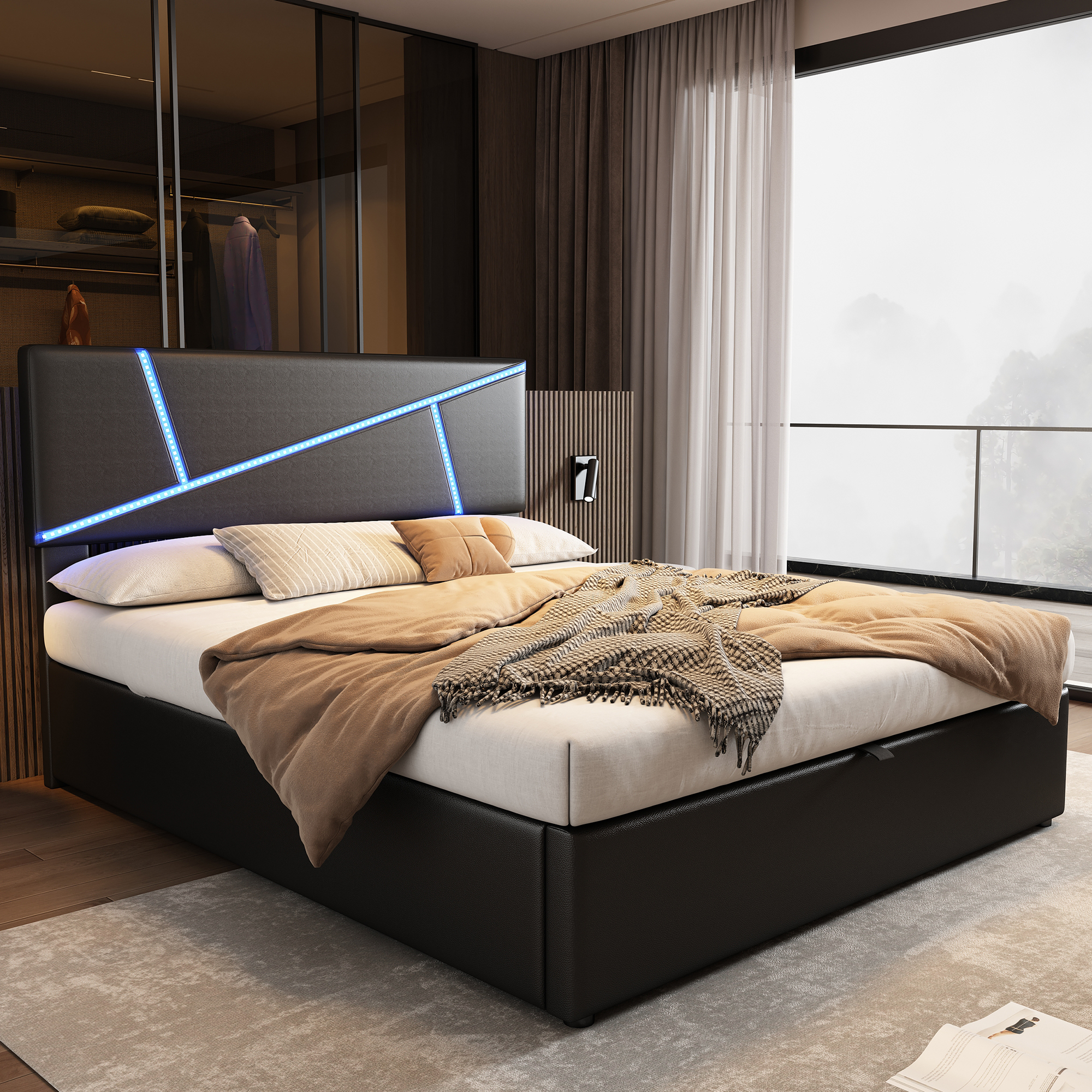 Comfort parisänky 140 x 200 cm LED-valonauhalla, hydraulinen pohja mustasta keinonahkasta