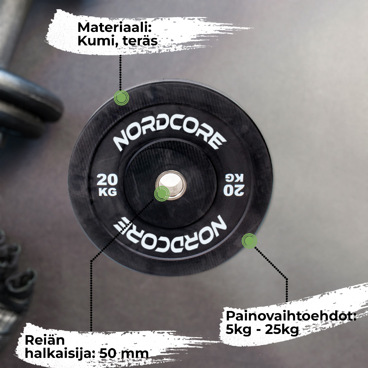 HUOM! Pakkaus sisältää yhden levypainon. Kaksi Nordcore Bumper-levypainoa sisältävän vaihtoehdon löydät täältä.