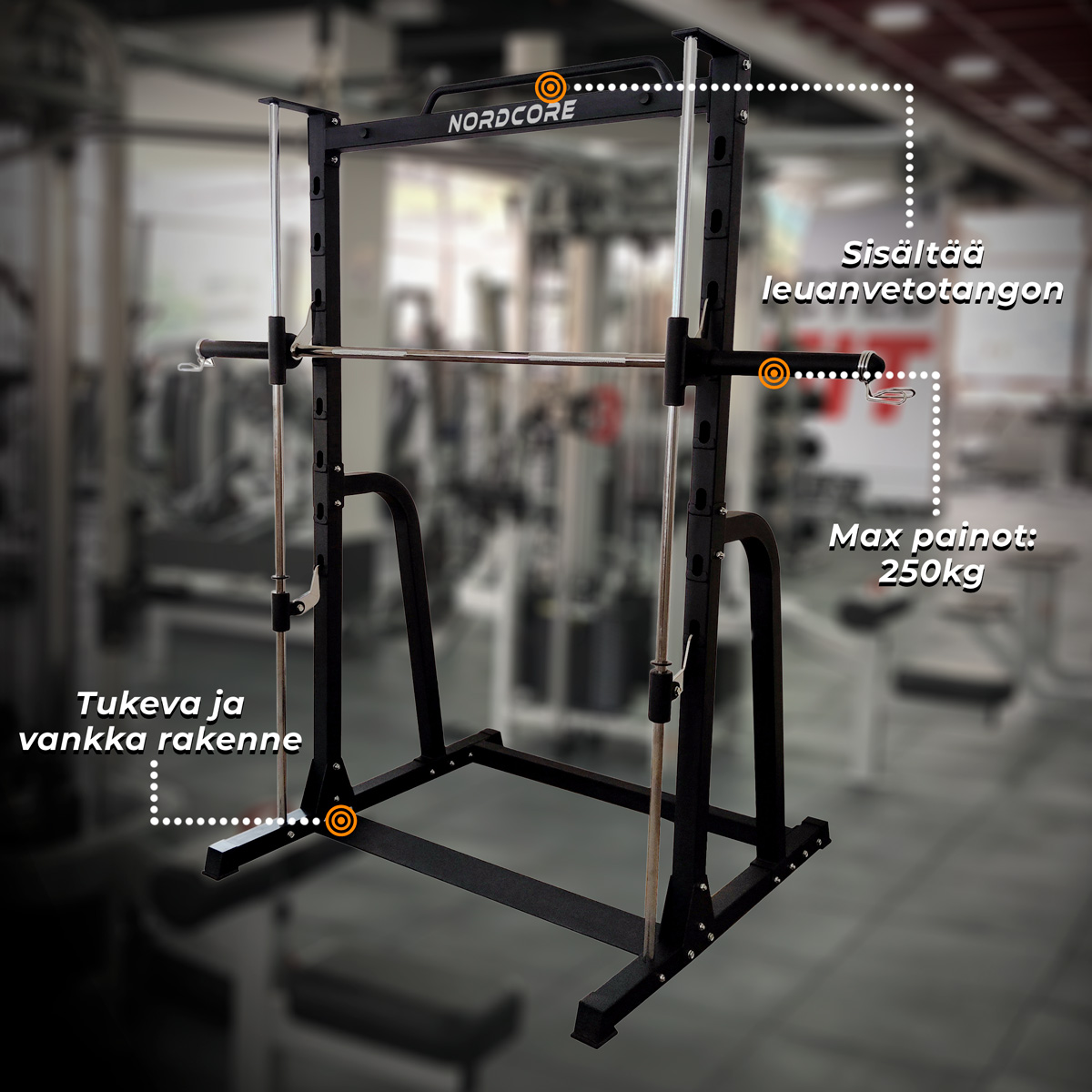 <ul><li>Tukeva ja vankka Smith laite varmistaa turvalliset liikeradat voimaharjoittelussa<br></li><li>Mitat: 211,5 x 128 x 202cm<br></li><li>Max painot: 250 kg</li></ul> NordcoreMusta