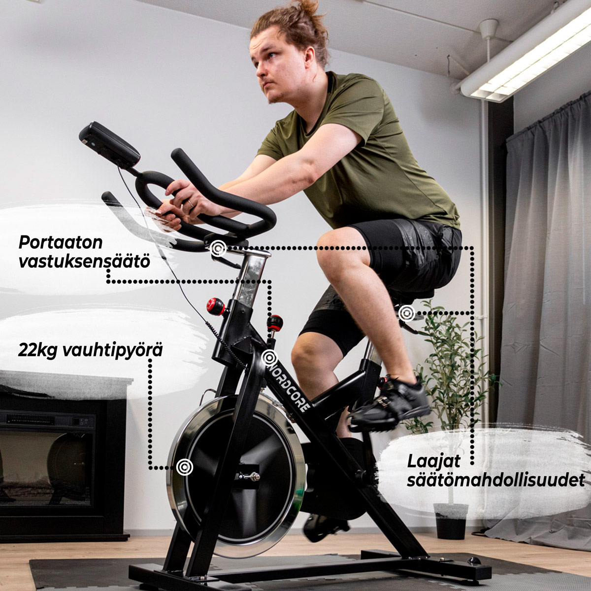 Spinningpyörä on mainio ratkaisu kotikuntoilulaitteeksi. Sen avulla pääset treenaamaan maantiepyöräilyä muistuttavalla tavalla ja se mahdollistaa kovemman treenaamisen kuin tavallinen kuntopyörä. Nordcore Spinningpyörä 2200:n käyttäjän suosituspituus on 150–190 senttimetriä ja paino maksimissaan 135 kilogrammaa.