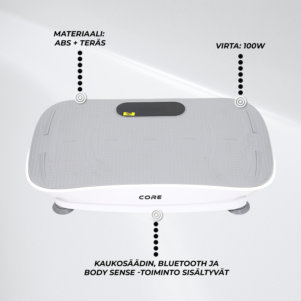 <p>Tärinälevy mahdollistaa säätöjen muuttamisen kätevästi mukana tulevalla kaukosäätimellä, jolloin voit keskittyä treenaamiseen ilman keskeytyksiä. Olipa sijaintisi sitten kotona tai toimistossa, Nordcore Tärinälevy 3000 yhdistää käytännöllisyyden ja tehokkaat tulokset tyylikkäässä paketissa. Saatavilla on myös 'Body Sense' -ominaisuus, joka mukauttaa värähtelyä kehosi reaktioiden mukaan tarjoten personoidun kuntoilukokemuksen.</p>