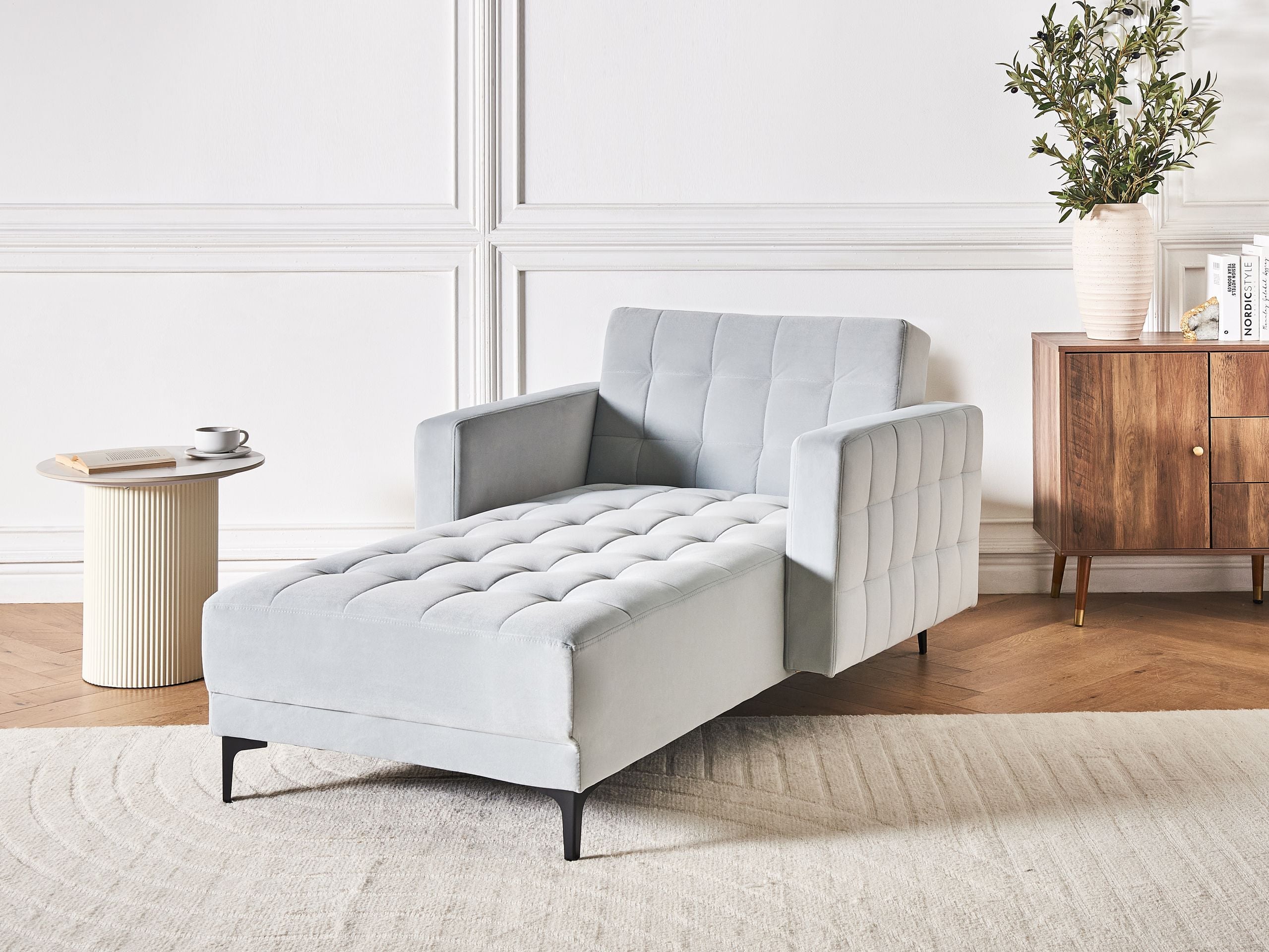 Moderni tuftattu säädettävä divaani. Puhtaat linjat ja mukavuus ovat tämän divaanin ominaisia piirteitä. Sen runko on verhoiltu kokonaan korkealaatuisella samettikankaalla ja viimeistelty tyylikkäällä tuftauksella. Säädettävän selkänojan ja napsautettavan mekanismin ansiosta se muuttuu viihtyisäksi vuoteeksi. Hillitty vaaleanharmaa väri sopii useisiin sisustuksiin ja värimaailmoihin. Modulaarisen muotoilunsa ansiosta se voidaan yhdistää muihin malliston kalusteisiin sopivan istuinkokonaisuuden luomiseksi. Se on erittäin vakaa mustien metallijalkojensa ansiosta.