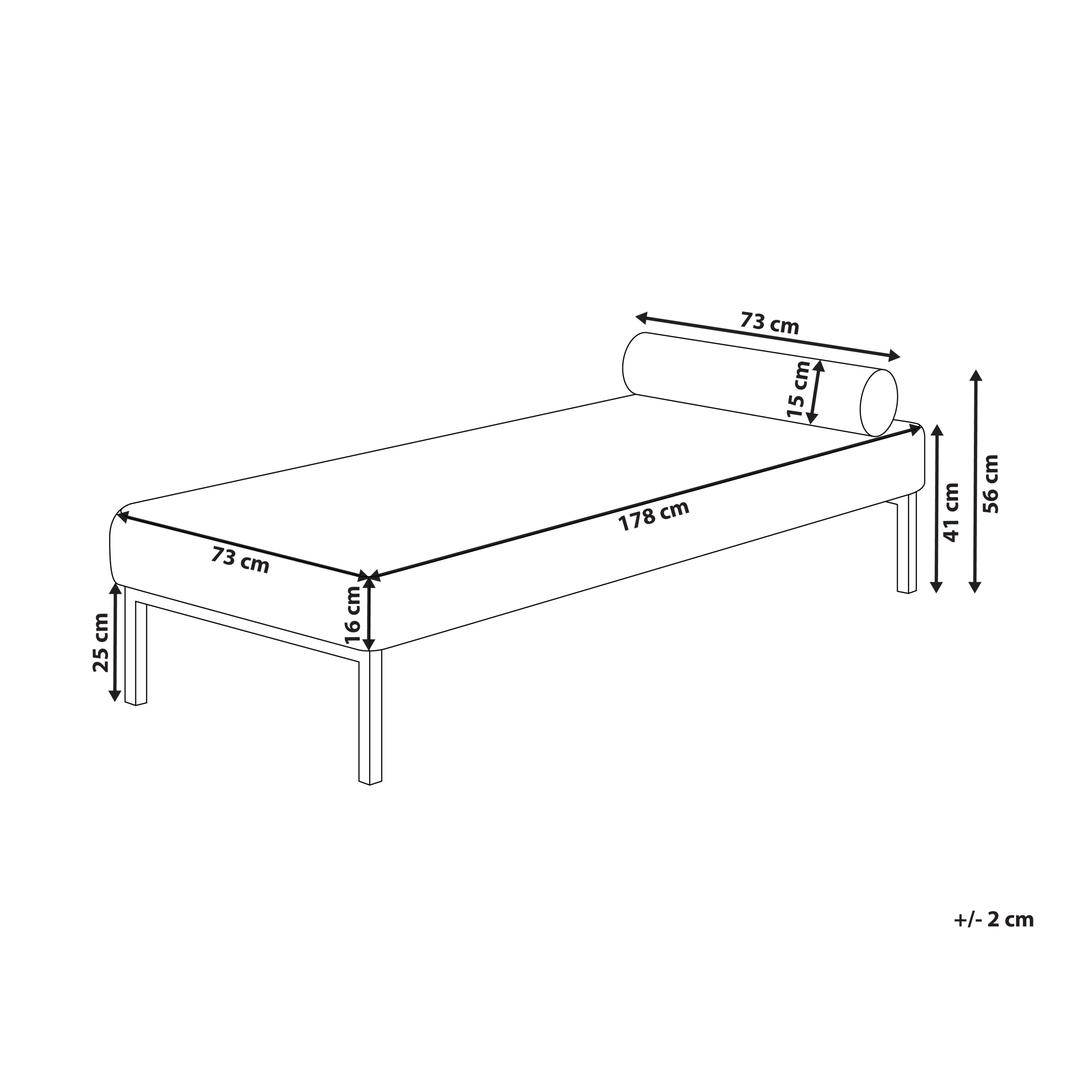 Tyylikäs makuutuoli koristetyynyllä. Tuo olohuoneeseen tai makuuhuoneeseen mukavuutta ja tyyliä tällä modernilla divaanilla. Sen muhkea bukleekangasverhoilu tarjoaa pehmeän ja kutsuvan istuma- tai makoilupaikan. Mukana tuleva yhteensopiva putkityyny tarjoaa lisämukavuutta, ja sen päällinen on irrotettavissa vaivatonta puhdistusta varten. Runkoa tukevat rautajalat, jotka tarjoavat vakautta ja kohottavat divaanin nykyaikaista muotoilua sekä universaalia väriä.