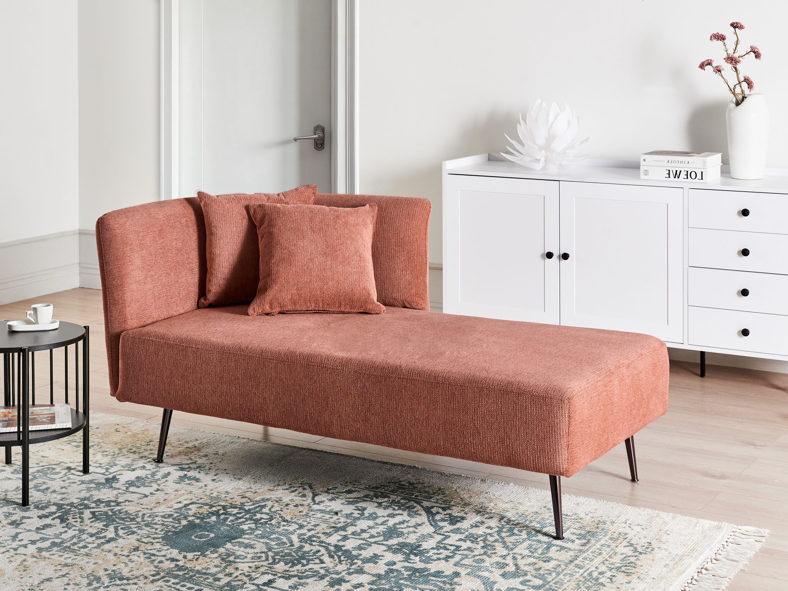 Moderni divaani koristetyynyillä. Löydä modernin mukavuuden ja tyylin ruumiillistuma tällä monipuolisella divaanilla. Eukalyptuspuusta ja vanerista huolella valmistettu divaani on verhoiltu kestävällä polyesterikankaalla, joka takaa sekä kestävyyden että vaivattoman päivittäisen ylläpidon. Minimalistisen muotoilunsa ansiosta se täydentää saumattomasti minkä tahansa olohuoneen estetiikkaa. Mustat teräsjalat takaavat vakauden, mikä tekee divaanista luotettavan valinnan löhöilyyn. Lisäksi mukana tulevien kahden muhkean koristetyynyn tarjoama ylellisyys nostaa rentoutumiskokemuksen uudelle tasolle.