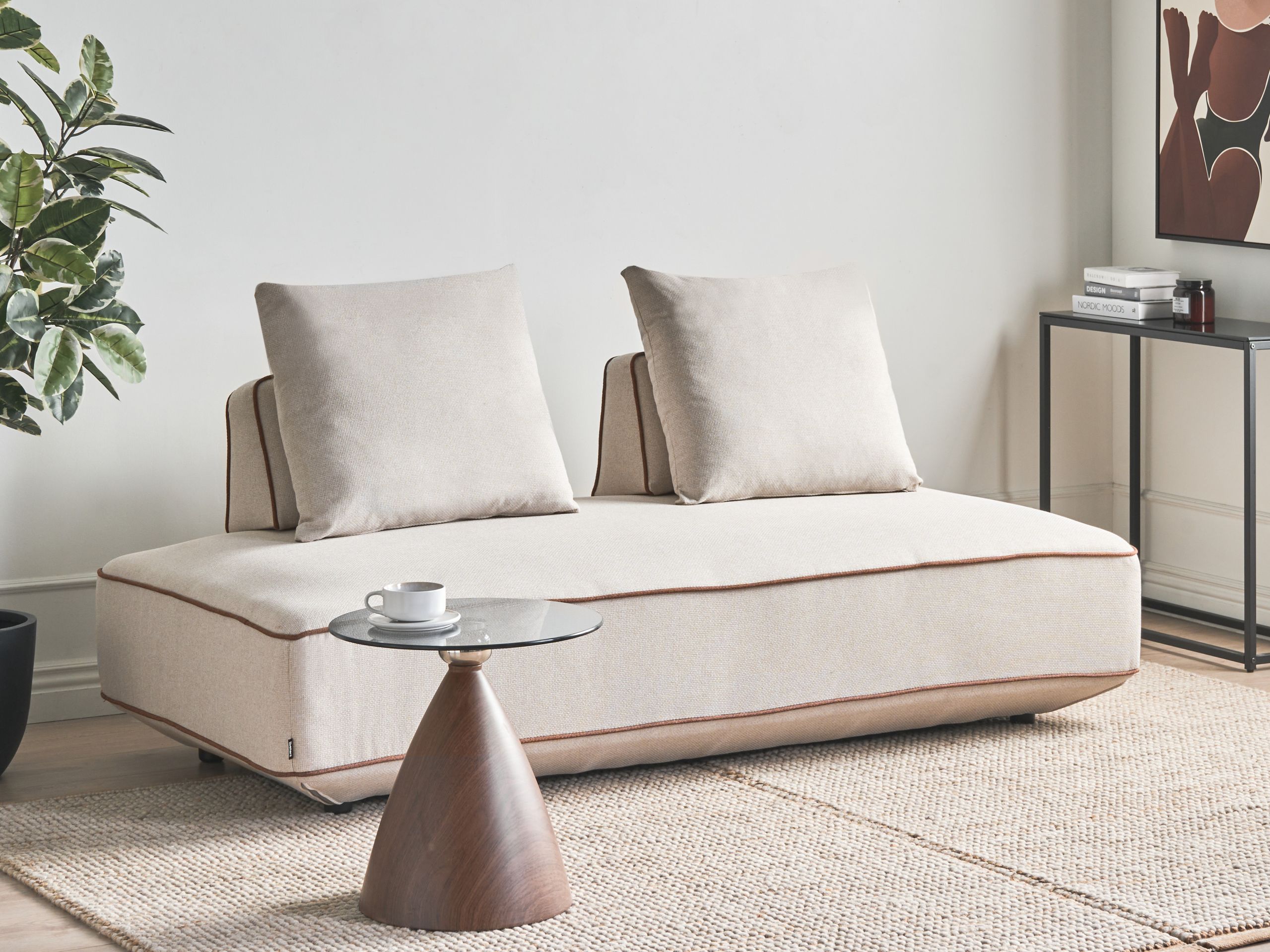 Moderni lepotuoli koristetyynyillä. Tämä moderni divaani tuo olohuoneeseen hillittyä eleganssia ja mukavuutta. Helposti puhdistettavalla vaaleanbeigellä kankaalla verhoillun divaanin mukana tulee kaksi selkätyynyä, joissa on luistamattomat pohjat, sekä kaksi koristetyynyä, jotka viimeistelevät ilmeen. Yhdistämällä kaksi divaania voit luoda tyylikkään kulmakokonaisuuden, joka lisää tilaan sekä mukavuutta että monipuolisuutta. Selkätyynyt voivat siirtyä paineen alla, eikä niitä ole tarkoitettu nojaamiseen. Divaanin sijoittaminen seinää vasten takaa parhaan asetelman ja maksimaalisen mukavuuden.