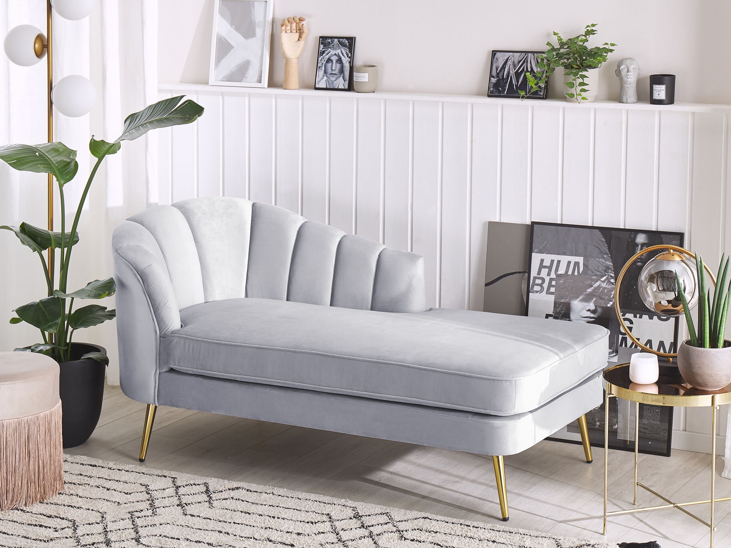 Tyylikäs verhoiltu lepotuoli. Tämä tyylikäs divaani on näyttävä valinta jokaiseen olohuoneeseen tai makuuhuoneeseen, tuoden siihen ripauksen glamouria. Sen kestävä puinen runko on verhoiltu ajattoman vaaleanharmaalla samettikankaalla, joka yhdessä kullanväristen rautajalkojen kanssa muodostaa ylellisen kokonaisuuden. Pehmeä, paksu pehmuste irrotettavalla päällisellä takaa miellyttävän käyttökokemuksen. Selkänoja on koristeltu yksinkertaisella pystysuoralla tikkauksella, mikä tekee lepotuolista elegantin lisän mihin tahansa sisustukseen.