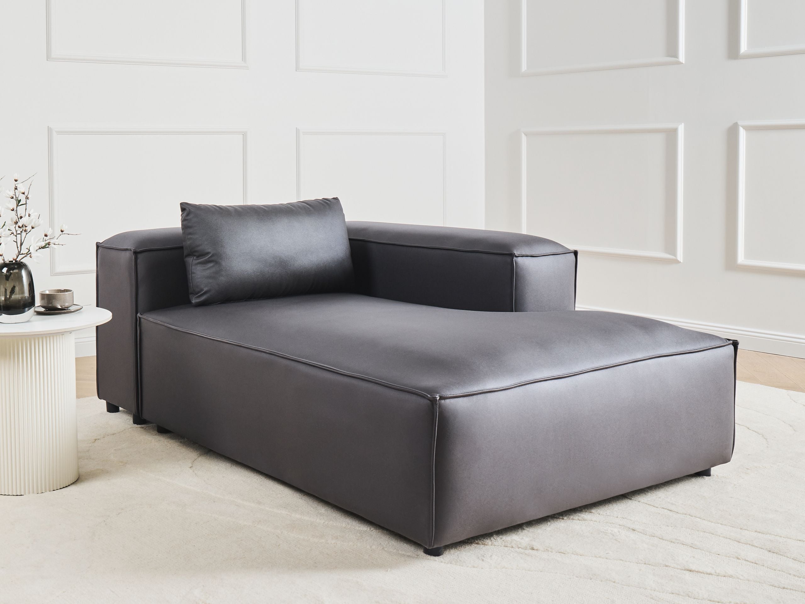 Moderni moduulisohvan divaani koristetyynyllä. Tämä monipuolinen vasen divaani sopii jokaiseen moderniin sisustukseen. Sen pehmeä ja kestävä vegaaninen ekonahkaverhoilu on helppo puhdistaa, ja se on viimeistelty tyylikkäällä mattapinnalla. Tiheä vaahtomuovitäyte tarjoaa mukavuutta ja säilyttää muodon pitkään, kun taas tukeva rakenne mahdollistaa käytön itsenäisenä loikoilupaikkana tai moduulisohvan jatkeena. Hillitty mutta virtaviivainen muotoilu täydentää vaivattomasti monenlaisia sisustustyylejä, sopien saumattomasti olohuoneeseen. Se tarjoaa erinomaisen yhdistelmän käytännöllisyyttä ja minimalistista tyyliä sekä on helppo yhdistää osaksi erilaisia asetelmia.